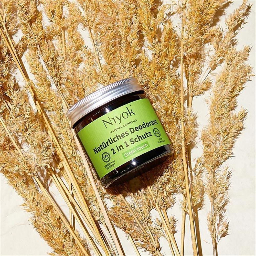 Niyok 2in1 Deodorant Green Touch, 40 ml Unsere Deocreme Green Touch wirkt auch an sehr stressigen Tagen mit ihrem natürlichen, feinherben Geruch beruhigend. Fast so wie ein Waldspaziergang. Der würzige Duft nach Kardamom und das Blumige der Mimosa sind für jede Nase wohltuend. ANTITRANSPIRANT - Schutz vor Schweiss, ganz ohne Aluminium 100% NATÜRLICH - ohne synthetische Inhaltsstoffe, Alkohol & Mikroplastik für empfindliche Achseln - reizt nicht und pflegt die Achseln durch hautschonende Shea Butter REAGIERT MIT DEINER KÖRPERTEMPERATUR - lässt sich leicht verteilen und verklumpt nicht ZERTIFIZIERTE NATURKOSMETIK (Made in Germany) - nur vegane und unbedenkliche Inhaltsstoffe. Ohne: PEGs, Parabene, SLS. SEHR ERGIEBIG - eine erbsengrosse Menge hält dich den ganzen Tag frisch
