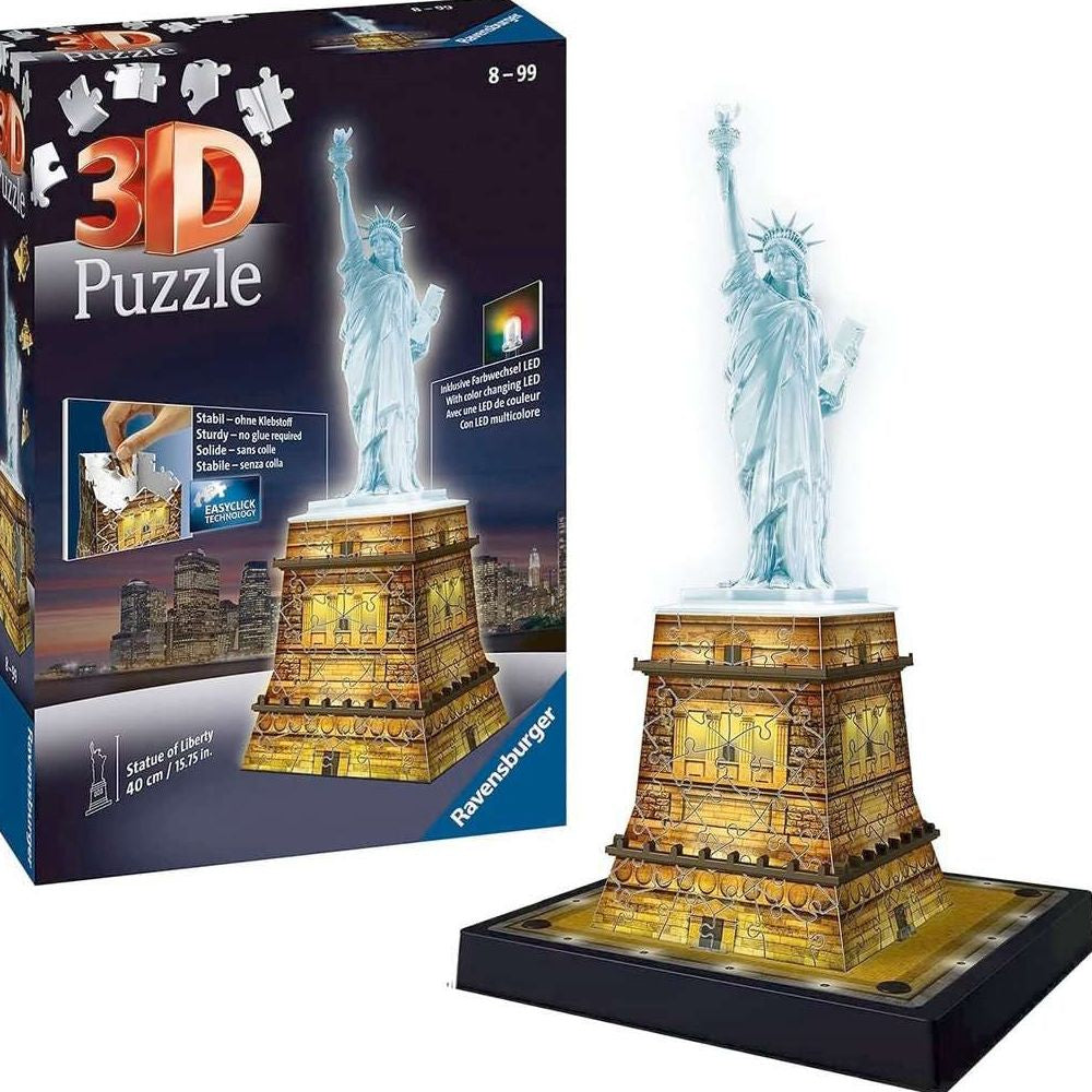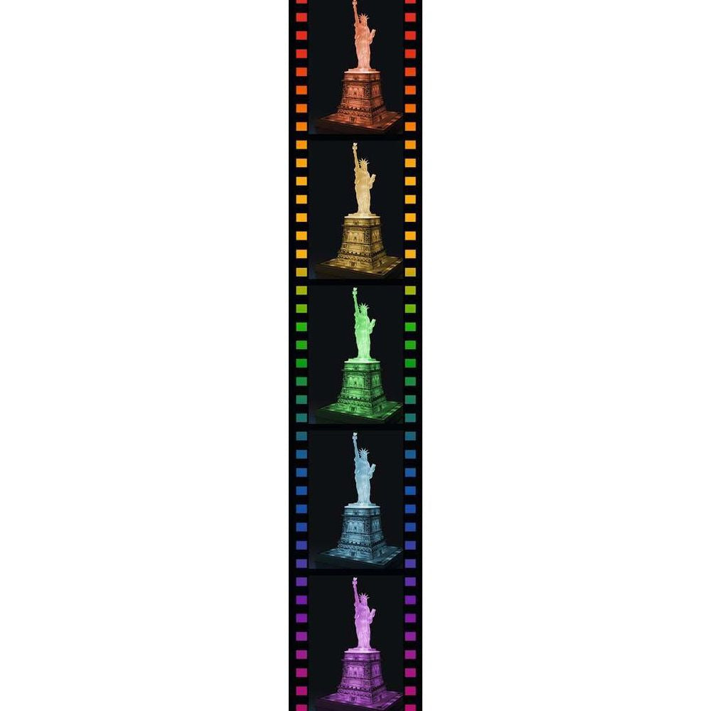 Ravensburger 3D Puzzle Freiheitsstatue bei Nacht Big-Apple-Feeling für zu zu Hause Wow, welch ein Anblick! Seit 1886 heißt die Freiheitsstatue im Hafen von New York alle Neuankömmlinge willkommen und symbolisiert auf eindrucksvolle Art und Weise Hoffnung und Freiheit. Holen Sie sich mit dem Ravensburger 3D Puzzle Freiheitsstatue bei Nacht das berühmte Wahrzeichen New Yorks nach Hause. Das 3D Puzzle Freiheitsstatue bei Nacht mit 40 cm Höhe ist ein detailgetreues Bauwerk. Besonders imposant ist die Lady Liberty jedoch nach Einbruch der Dunkelheit: Dank der beiliegenden LEDs strahlt das 3D Puzzle von innen und wird so zu einem echten Hingucker egal ob in der dem Original nachempfundenen Beleuchtung oder in der Farbwechselvariante mit unterschiedlichen Farbtönen. Die innovativen Kunststoff-Puzzleteile des Sockels passen dank EasyClick Technology perfekt ineinander und formen ein stabiles Bauwerk, ganz ohne Kleben. Gepuzzelt wird entweder nach Motiv oder nach Zahlen. Die Nummerierung der einzelnen Puzzleteile erleichtert das Vorsortieren. So ist das Puzzeln ganz leicht und unkompliziert! Vervollständigt wird das 3D Puzzle durch die originalgetreue und detailliert ausgearbeitete Figur der Freiheitsstatue.