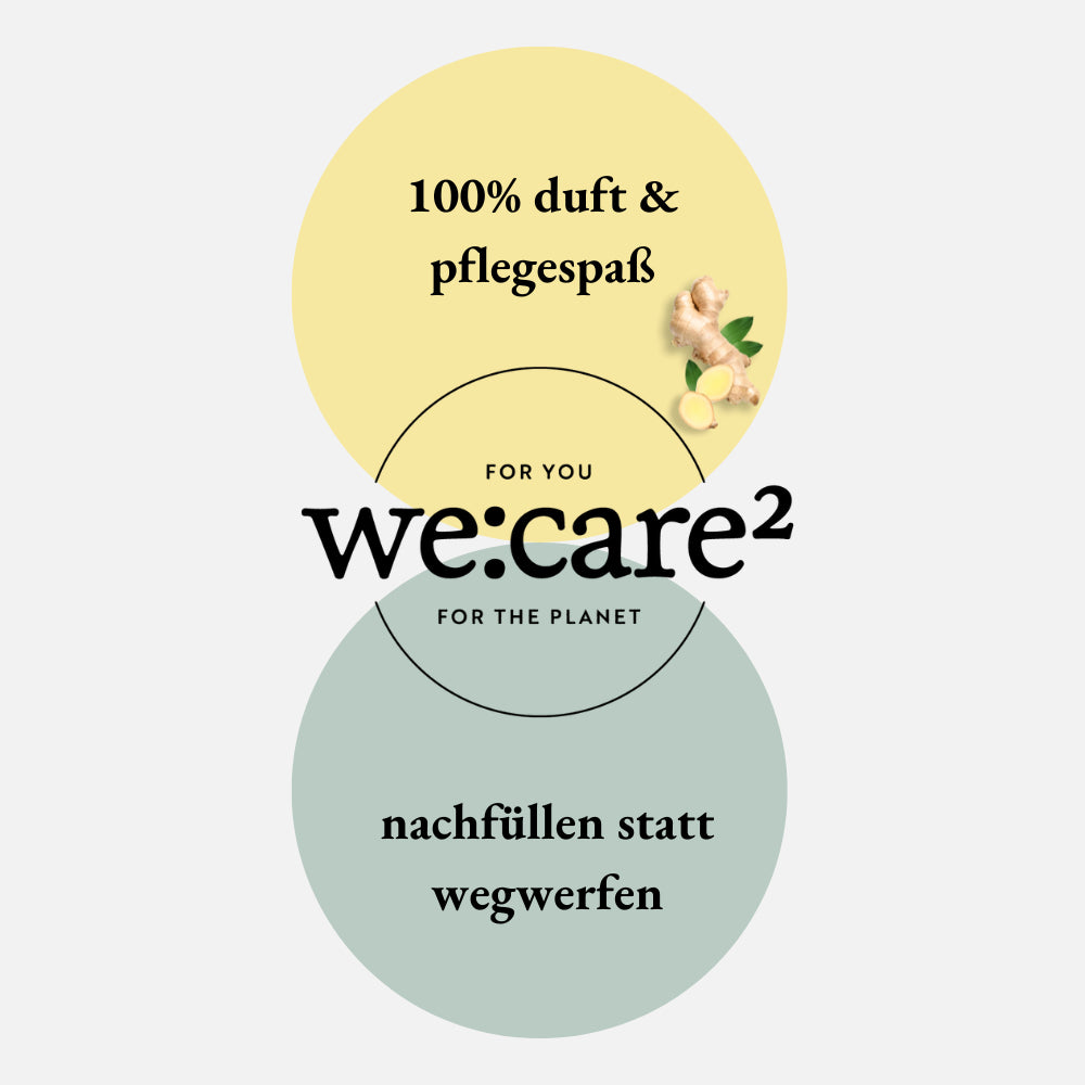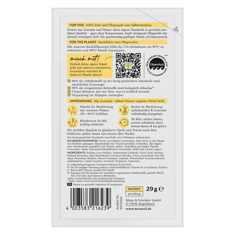 #Mischmit – Handseife selbst mischen und Plastik sparen! Wir haben etwas Neues für dich, was gut für dich und die Umwelt ist: Aus Granulat und Wasser kannst du deine eigene Handseife kreieren. Ganz einfach. Die Qualität und Pflegeeigenschaften der selbst angemischten Seife stehen herkömmlichen Flüssigseifen in nichts nach. Der einzige Unterschied: Du entscheidest dich bewusst dafür, Ressourcen zu schonen - ohne Kompromisse in der Qualität. FOR YOU: 100% Duft und Pflegespass Sinnliches Dufterlebnis: Der aromatische, zitrisch-würzige Duft von Ingwer und Bergamotte bleibt dezent auf deiner Hand, sodass du dich frisch und belebt fühlst. Weniger ist mehr: Die cleane Rezeptur enthält nur das, was es wirklich braucht für sanfte Reinigung und ein sauberes und gepflegtes Hautgefühl. Sanfte Reinigung: Die Handseife ist glasklar, schäumt sanft auf und reinigt deine Hände besonders schonend, ohne sie zu reizen. Für geschmeidig gepflegte Hände. Dermatologisch bestätigt: Die Rezeptur wurde von Dermatest mit sehr gut bewertet und ist pH-hautneutral. Patent pending: Durch die zum Patent angemeldete Rezeptur steht die selbst angemischte Handseife in Qualität und Pflegeeigenschaften herkömmlichen Flüssigseifen in nichts nach. FOR THE PLANET: Nachfüllen statt wegwerfen Nachhaltigkeit neu gedacht: Das Seifenpulver kann in der we:care² Flasche oder dem Seifenspender deiner Wahl immer wieder angemischt werden. Weniger Plastik und CO₂: Somit kannst du mit nur einem Handgriff durch die Nutzung des Seifenpulvers im Papier-Sachet 90% Plastik einsparen (A). Das entspricht 26 Plastikflaschen im Jahr. Da du das Granulat erst zu Hause mit Wasser anmischst, entfällt es beim Transport und du sparst 87% CO₂ ein (B). Natürlicher Ursprung & biologisch abbaubar: 96% der Inhaltsstoffe der fertig gemischten Handseife sind natürlichen Ursprungs (C) und 99% der eingesetzten Rohstoffe biologisch abbaubar (D). Vegan und mikroplastikfrei: Unsere Rezeptur ist mikroplastikfrei, enthält also keine wasserlöslichen, rein synthetische Polymere. Misch mit: werde auch du Teil der Bewegung A: bei 10-maliger Nutzung unserer wiederbefüllbaren Flasche (250ml) & Sachets B: aufgrund geringeren Transportvolumens & Gewicht C: davon 88% Wasser gemäss ISO 16128 D: bezogen auf die Summe der einzelnen organischen Inhaltsstoffe, gemäss OECD 301, 302 oder äquivalenten Methoden ANWENDUNG 1. Flasche bis Markierung mit warmem Wasser befüllen 2. Sachet aufschneiden und Seifenpulver vollständig hinzugeben 3. 10 Sekunden kräftig schütteln 4. 30 Minuten stehen lassen, kurz schütteln, erneut schütteln, kurz setzen lassen & los geht’s Tipp: Für perfekte Qualität und glasklare Optik und Textur kannst du die Seife am besten über Nacht stehen lassen. Duftrichtung Ingwer/Bergamotte Inhaltsstoffe Sodium Coco-Sulfate, Ammonium Chloride, Citric Acid, Parfum (Fragrance), Sodium Benzoate, Aloe Barbadensis Leaf Juice Powder, Citrus Aurantium Peel Oil, Aqua (Water), Potassium Sorbate, Hexyl Cinnamal, Linalool, Tetramethyl Acetyloctahydronaphthalenes, Linalyl Acetate, Geraniol, Terpineol, Limonene