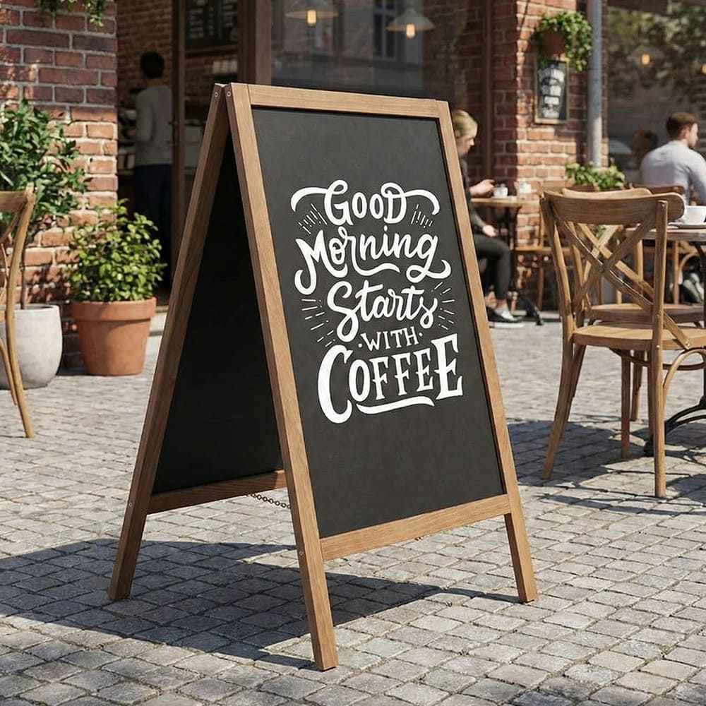 Ob als Menütafel vor deinem Restaurant, als Werbetafel im Eingangsbereich oder als flexibles Infoboard – der magnetische Holz Kundenstopper 95×54 cm Dunkelbraun verbindet natürliche Eleganz mit praktischer Vielseitigkeit. Ideal für alle, die ihre Werbung wetterfest, kreativ und professionell präsentieren möchten.