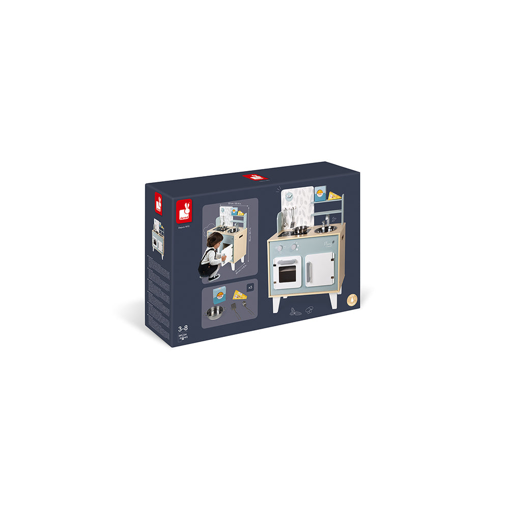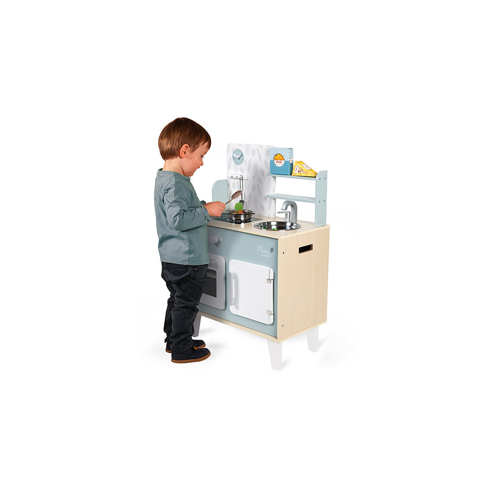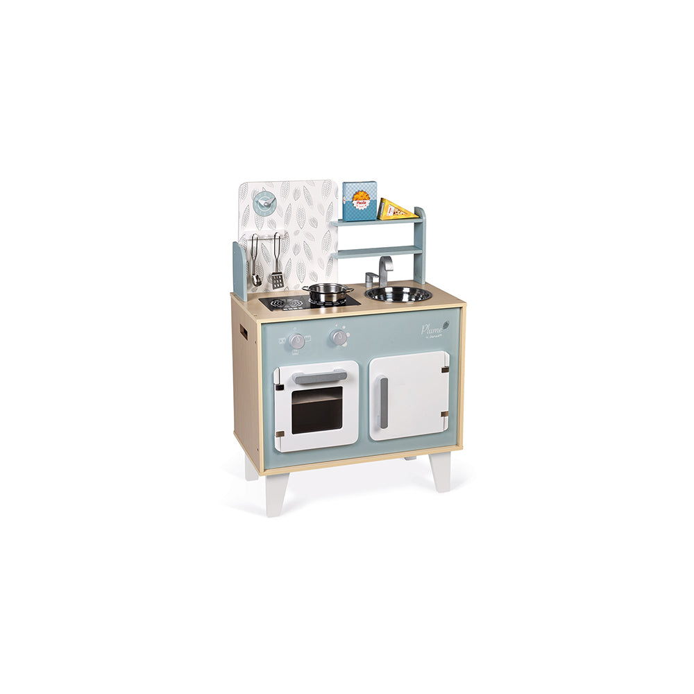 Janod Küche Plume Schnell, der Kochkurs beginnt! Wir eilen geschäftig hin und her, um für Mama und Papa die besten Gerichte zu kochen! Mit dieser schönen Kochnische ist die Zubereitung leckerer Gerichte ein wahres Vergnügen für Kinder ab 3 Jahren! Um ein großer Küchenchef zu werden, ist diese Küche aus naturbelassenem Holz und in graublauen Farbtönen mit zahlreichen Utensilien ausgestattet: ein Haken zum Aufhängen des Spaghettilöffels und des Pfannenwenders aus Metall, dazu ein Topf aus Metall und zwei Lebensmittelpackungen aus Pappe - den unverzichtbaren Nudeln und Käse. Um die Induktionsplatten einzuschalten, werden die zwei Drehknöpfe mit Geräuscheffekten gedreht! Diese Kinderküche ist ebenfalls mit einem Backofen, einem Schrank mit Magnettüren, einer Edelstahlspüle und einer Uhr ausgestattet. Fünf Accessoires werden mit diesem schönen Rollenspielzeug geliefert, das mit zarten Federn geschmückt ist. Höhe der Arbeitsplatte: 50 cm. Masse: 53 x 30 x 78 cm.