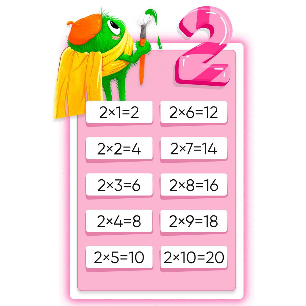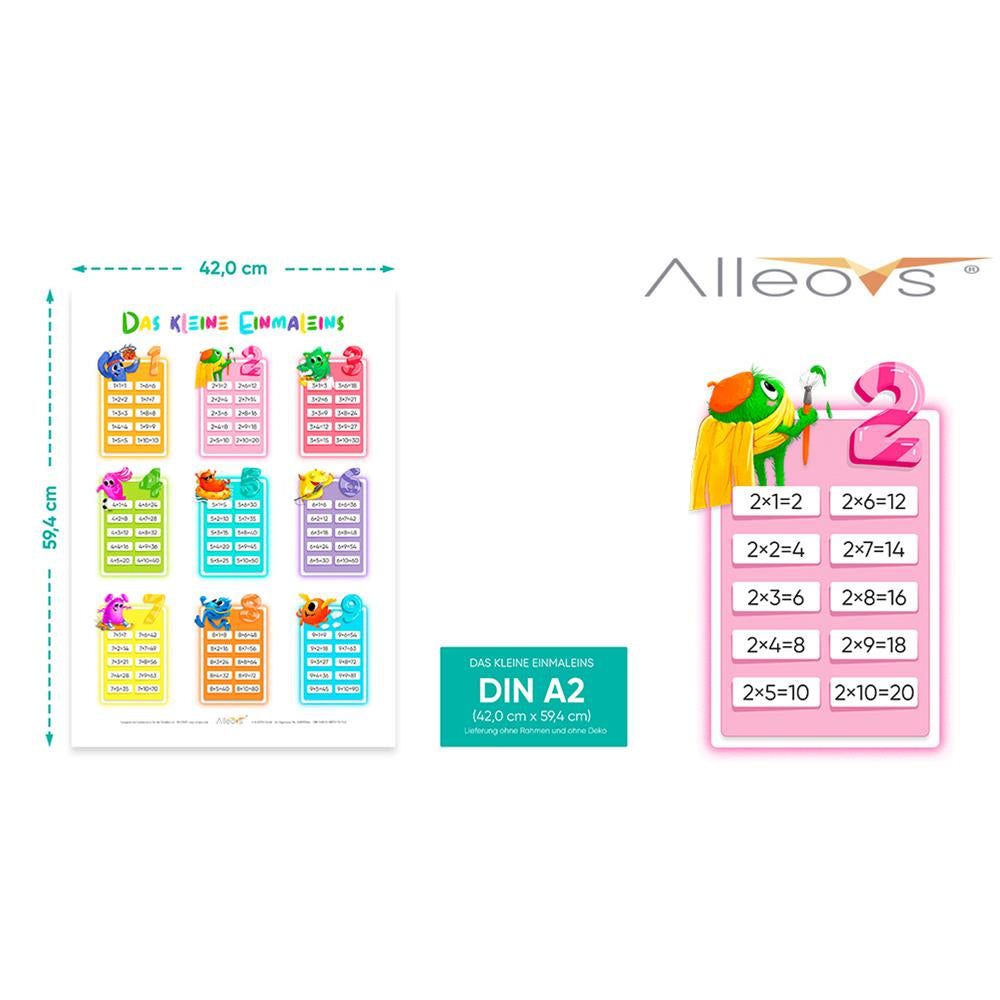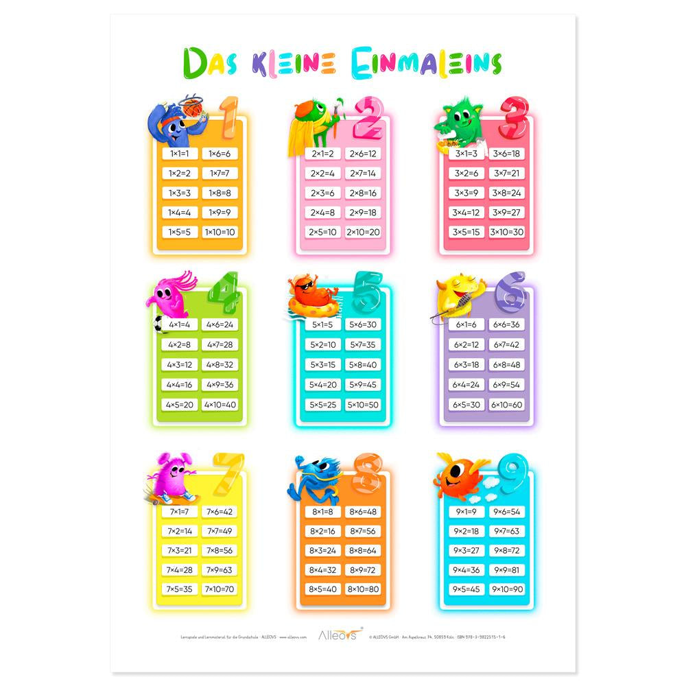 Das Einmaleins Lernposter Das kleine Einmaleins vereint Spielspass mit Visualisierung, um die Multiplikation und ihre Regeln schnell zu lernen. Dank der farbenfrohen Zeichnungen der Mathemonster macht das 1×1 Poster noch mehr Lust auf Mathematik. Die Zahlen sind in 10er Blöcken in Reihen von Eins bis Zehn dargestellt und fördern das Erlernen der Einmaleins Reihen. Das Poster ist für die Schule und zu Hause ideal. Geeignet als Wanddeko für den Kindergarten, die Grundschule oder als Geschenk zum Geburtstag.