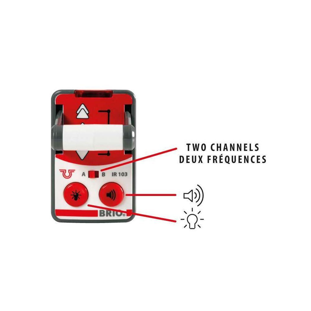 Du wirst zum Zugführer mit der einfach zu bedienenden IR-Fernsteuerung. 2 Geschwindigkeiten vorwärts, eine rückwärts, 2 Knöpfe für Licht- und Signaleffekte. A&B Frequenzen ermöglichen es 2 IR-Zügen gleichzeitig die Schienen zu nutzen.