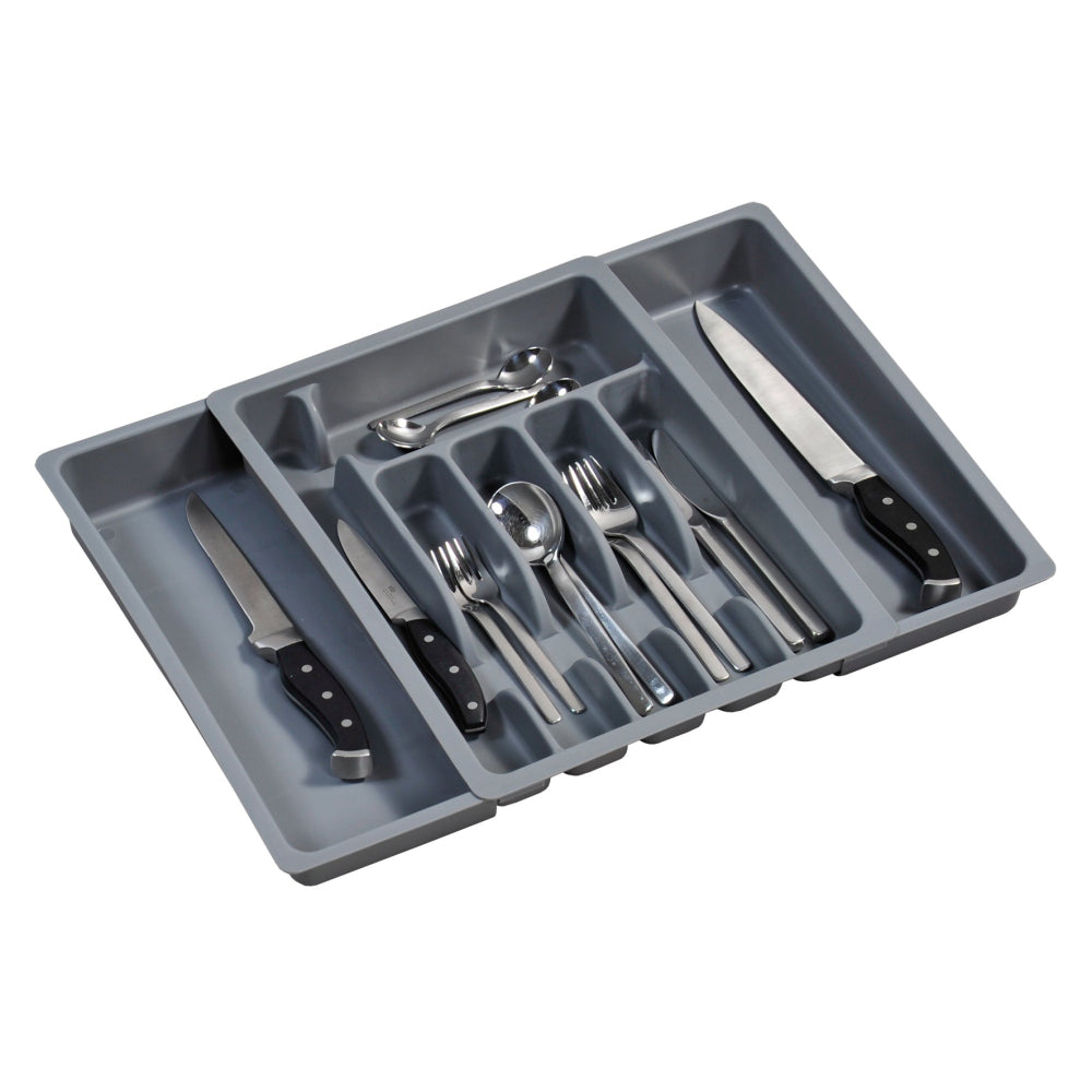 Essentielle Merkmale Verleihen Sie Ihrer Küche mehr Ordnung und Stil mit unserem variabel einsetzbaren, aus Kunststoff gefertigten, ausziehbaren Besteckkasten. Die perfekte Lösung für eine organisierte und aufgeräumte Besteckschublade. Hohe Anpassungsfähigkeit Dank seiner Eigenschaft, beidseitig ausziehbar zu sein, kann unser Besteckkasten an alle handelsüblichen Küchenschubladen angepasst werden. Er kommt mit 6-8 Besteckfächern, die ausreichend Platz für alles von Messern und Gabeln, über Teelöffel bis hin zu Salatbesteck und Schneidemessern bieten. Leichte Wartung & Langlebigkeit Der Kunststoff-Besteckkasten ist feuchtigkeitsbeständig, robust und langlebig, was ausgezeichnete Haltbarkeit und lange Nutzungsdauer garantiert. Darüber hinaus ist er sehr leicht zu reinigen, was Ihnen eine stressfreie Handhabung ermöglicht. Hinweis Das auf dem Foto abgebildete Besteck ist nicht im Lieferumfang enthalten.