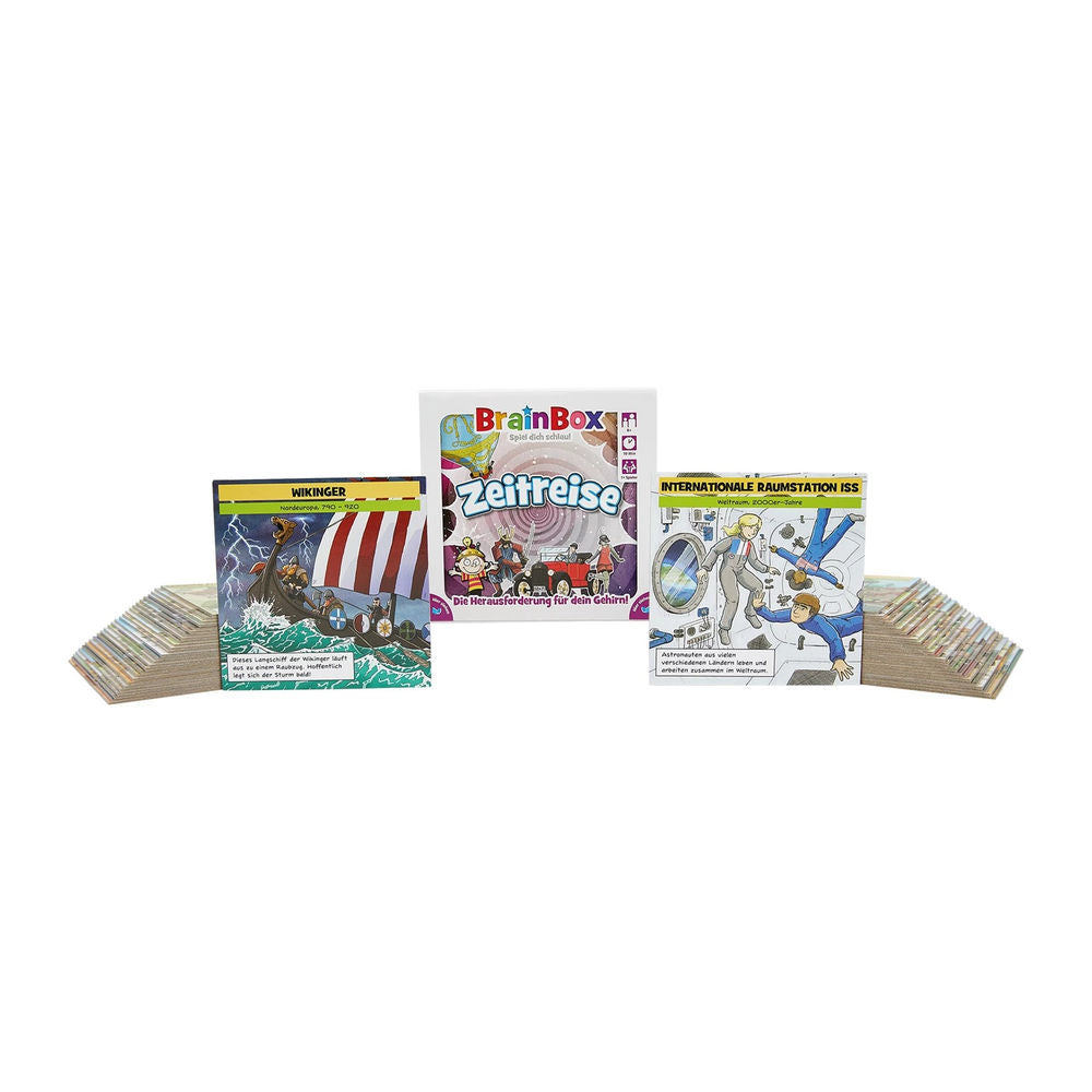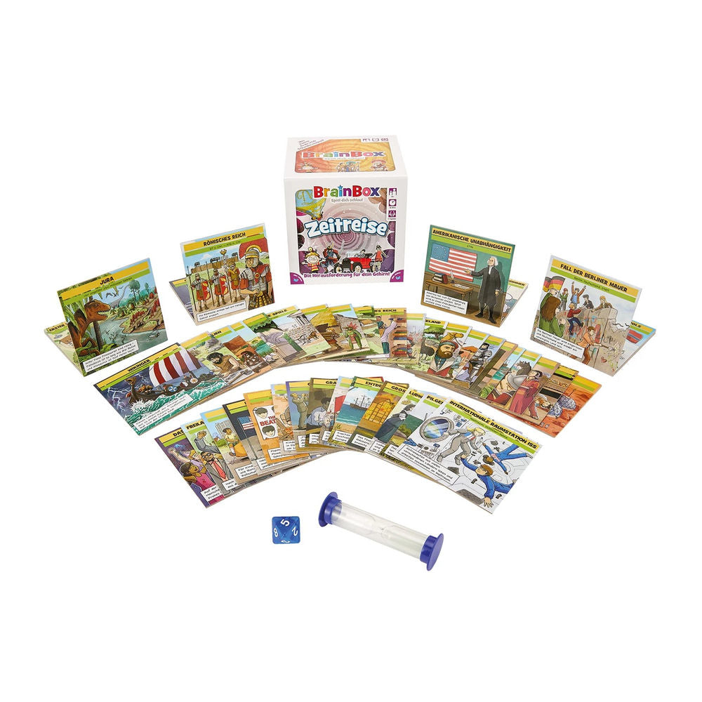 Brainbox Zeitreise (d) Jede Karte zeigt Bilder von den Dinosauriern bis zur Entdeckung Australiens, von der Steinzeit bis zum Fall der Beliner Mauer und vom Reich der Azteken bis zum ersten Flug mit einem Flugzeug. Auf der Rückseite jeder Karte stehen dazu acht Fragen zum jeweiligen Thema auf der Vorderseite. Die BrainBox fördert spielerisch die Beobachtungs- und Erinnerungsfähigkeit der Kinder.