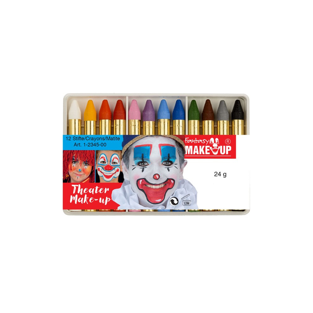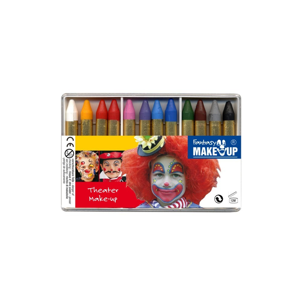 12 Schminkstifte in Schachtel Inhalt: 1x weiss, 1x orange, 1x dunkel orange, 1x rot, 1x rosa, 1x violet, 1x hellblau, 1x blau, 1x grün, 1x braun, 1x grau, 1x schwarz
