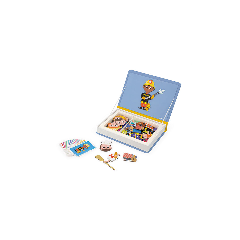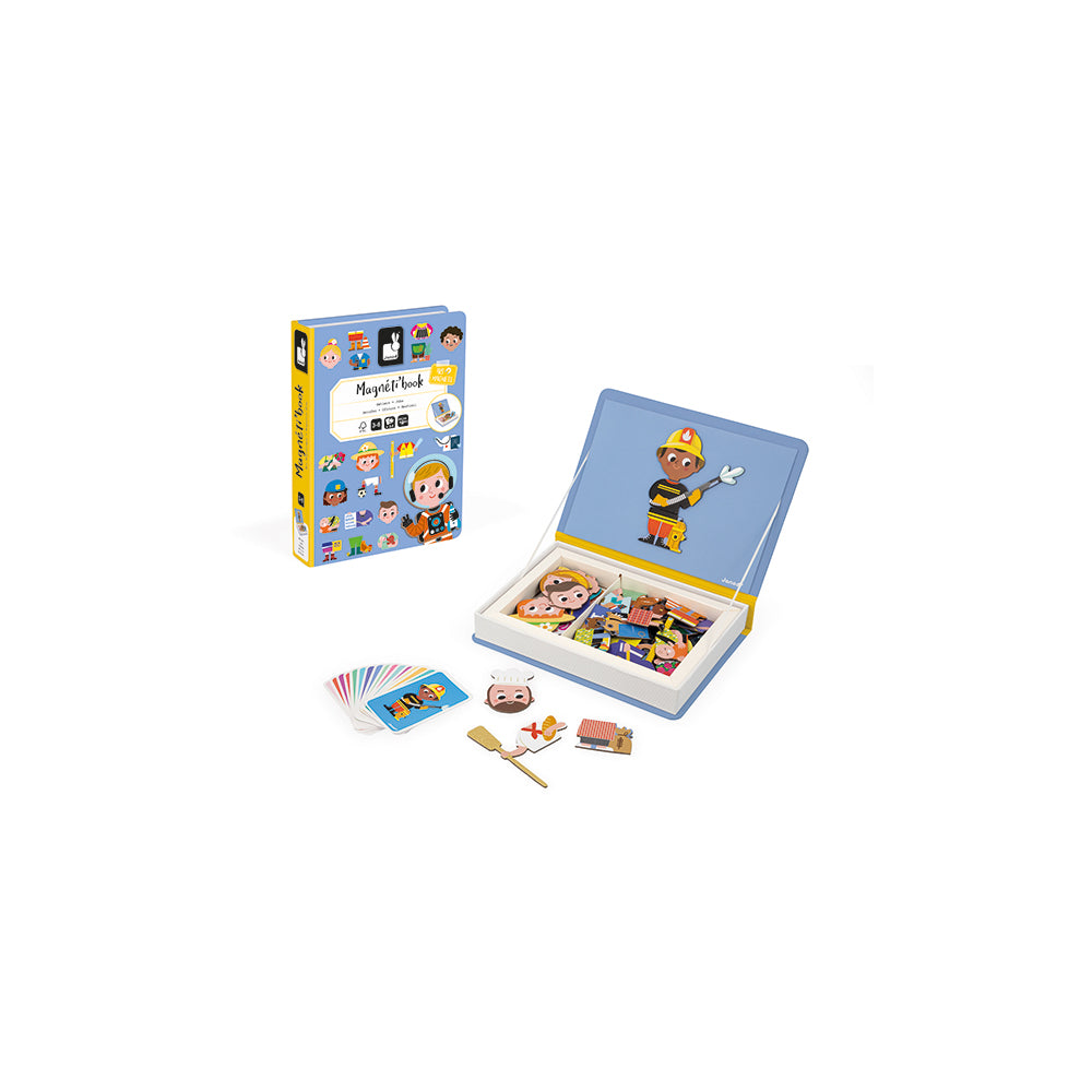 Quando sarò grande, sarò... Apri il tuo Magnéti'Book per scoprire le professioni! Con questo grazioso e colorato giocattolo magnetico, il tuo bambino scoprirà 16 professioni e potrà inventarne molte altre! È composto da una base magnetica, 48 magneti e 16 carte raffiguranti professioni note. I bambini più piccoli e più grandi si divertiranno un mondo a ricreare e combinare i modelli per creare professioni ibride, una più fantasiosa dell'altra. Giocattolo magnetico realizzato in cartone certificato FSC™ per bambini dai 3 agli 8 anni.