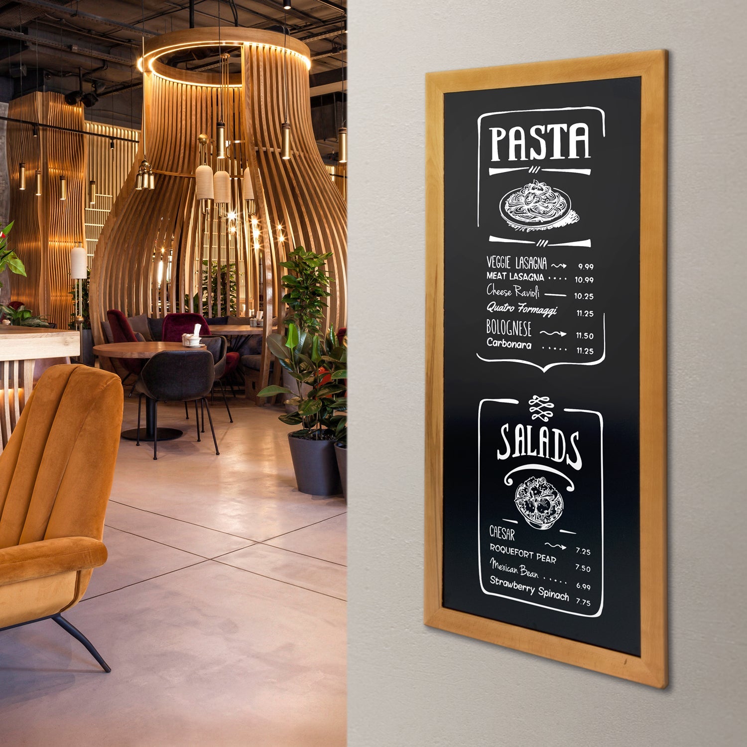 Die Tafel ist vielseitig beschriftbar – mit Kreide, Kreidemarkern oder auch mit Folien für besonders langlebige Inhalte. Sie ist robust, einfach zu reinigen und durch die hochwertige Verarbeitung für den täglichen Gebrauch bestens geeignet.