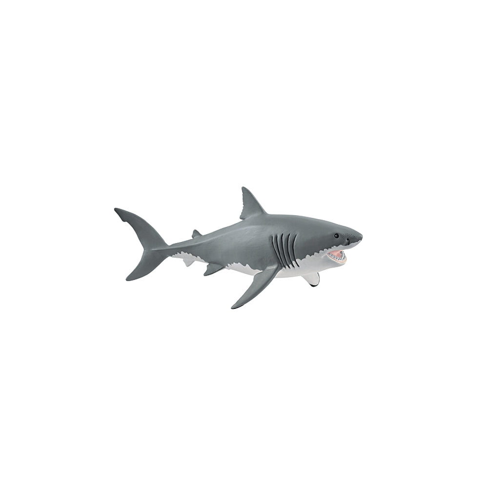 Grande squalo bianco Schleich. I personaggi Schleich sono tutti meticolosamente dettagliati, dipinti a mano con cura e rappresentano un gioco educativo. Il grande squalo bianco è il più grande pesce predatore del mondo. Possiede una cosiddetta dentatura a revolver, composta da diverse file di denti. Se uno dei denti triangolari e affilati si rompe dalla fila anteriore, viene semplicemente sostituito da uno della fila posteriore. I denti ricrescono costantemente.