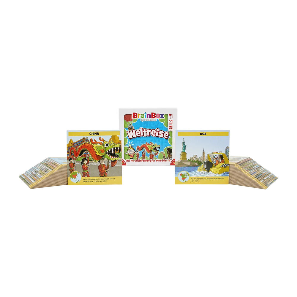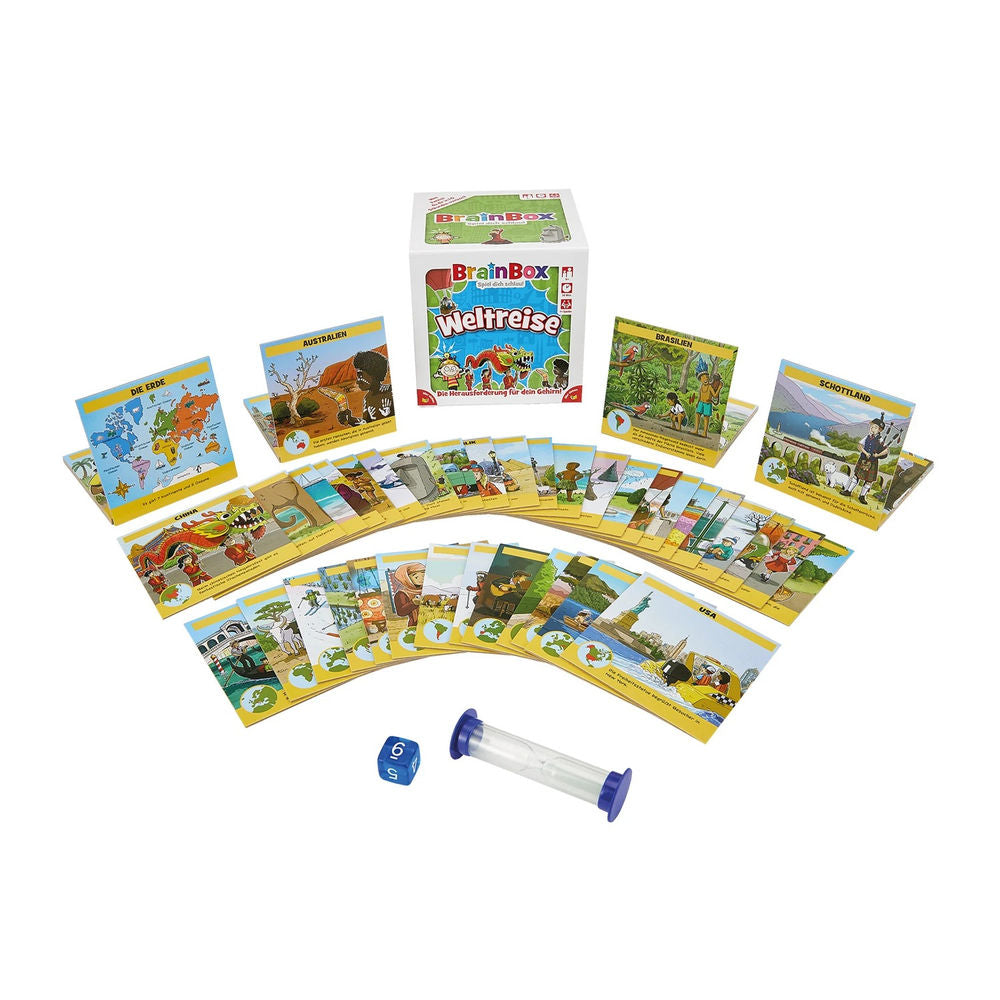 Brainbox World Tour (d) Ogni carta mostra immagini che spaziano dall'Outback australiano alla foresta pluviale amazzonica, dalle piramidi egizie alle spiagge di sabbia rosa delle Bermuda. Sul retro di ogni carta sono presenti sei domande relative all'argomento trattato sul fronte. BrainBox stimola in modo giocoso le capacità di osservazione e di memoria dei bambini.