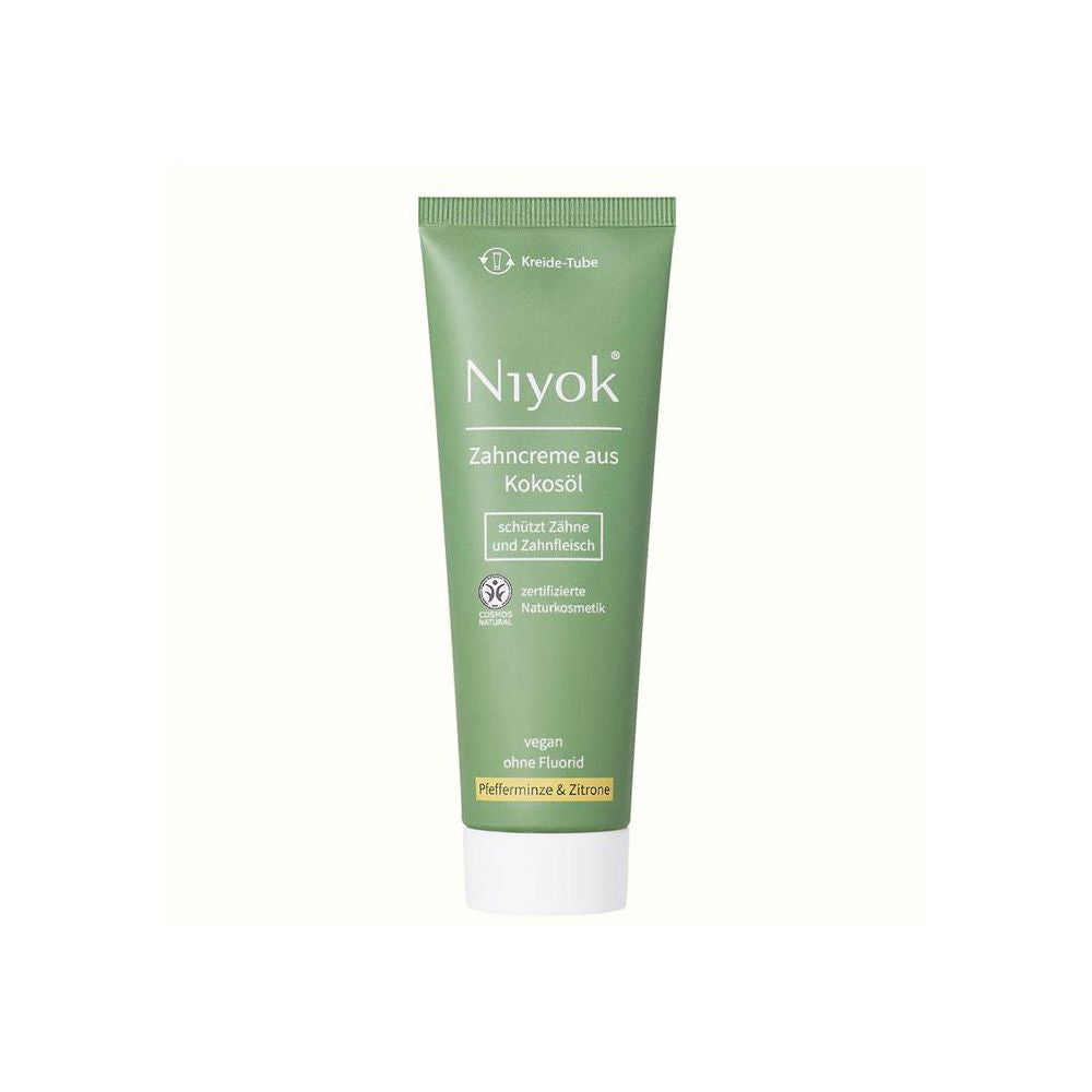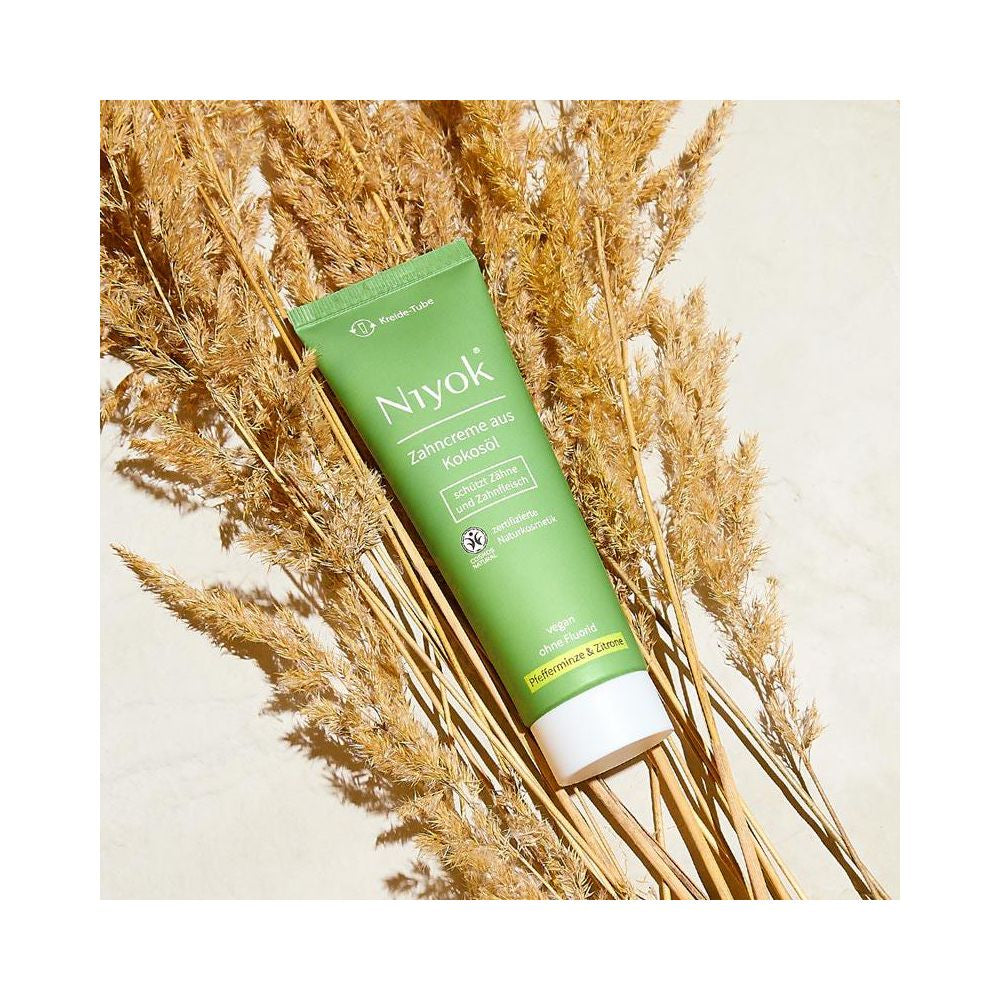 Dentifricio all'olio di cocco Niyok - Menta piperita e limone, 75 ml. Classico, equilibrato, rinfrescante. Non hai bisogno di sperimentare perché sai esattamente cosa vuoi. Il nostro Niyok Menta piperita e limone verde ti rinvigorisce ogni giorno con menta rinfrescante e limone acidulo. OLIO DI COCCO BIOLOGICO - la base del dentifricio con xilitolo. GUSTO - Menta piperita e limone. Aiuta a combattere l'alito cattivo e ti dona un alito fresco. Dentifricio SENSITIVE - vengono utilizzati solo abrasivi di gesso particolarmente delicati. Previene carie, placca, gengivite e tartaro. Adatto anche a denti sensibili e gengive sanguinanti. COSMETICI NATURALI CERTIFICATI (Made in Germany) - solo ingredienti vegani e sicuri. Senza PEG, parabeni, SLS, fluoro o microplastiche. Confezionato nel nostro tubo di gesso sostenibile. Applicazione: basta spremere una quantità pari a un pisello, o poco più, dal tubetto sulle setole dello spazzolino e spazzolare per almeno 2 minuti. Perché l'olio di cocco? L'olio di cocco ha proprietà antibatteriche e antinfiammatorie, proteggendo così denti e gengive. Ciò è dovuto all'acido laurico altamente concentrato, che costituisce circa il 50% dell'olio di cocco. Inoltre, utilizziamo il carbonato di calcio come abrasivo in tutti i nostri dentifrici. Il carbonato di calcio fornisce un'ulteriore remineralizzazione e quindi protegge i denti dagli attacchi degli acidi. Lo xilitolo completa il complesso di principi attivi interrompendo la riproduzione dei batteri che causano la carie e riducendone il numero.