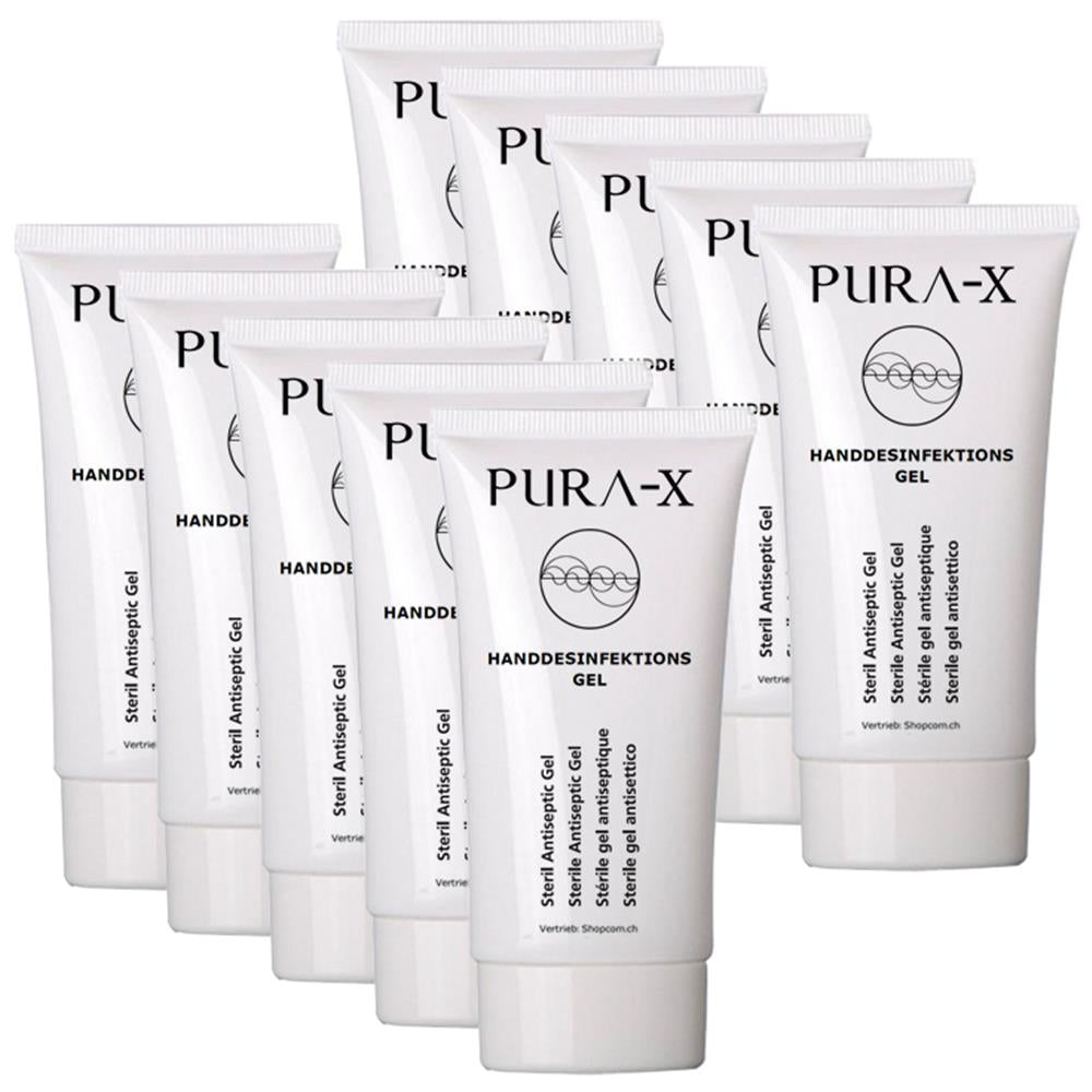 Pura-X 10er-Set Steril Antiseptic Gel, Swiss Made mit BAG Nr., 50 ml Ca. 3 ml Gel auf die trockene Handfläche geben, die Hände und Zwischenräume sorgfältig einreiben. Einwirkzeit: 30 Sek. (Standardbakterien und Influenza H1N1). Extrem praktisch da immer dabei! Composition: Ethanol 70% CAS n° 64-17-5 (corr. 700mg /g active ingredient) aqua, Hamamelis virginiana (witch hazel) extract, Cymbopogon winterianus (perfume), CI 42051, excipients. Entsorgung: Teilentleerte Gebinde in Sonderabfälle - Entleerte Gebinde in den Siedlungsabfall. Leicht entflammbar. Von Kindern fernhalten. Hergestellt in der Schweiz. CHZN (1857) /BAG/SZID 305336