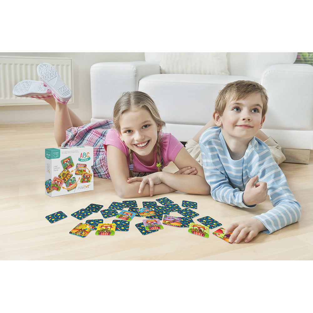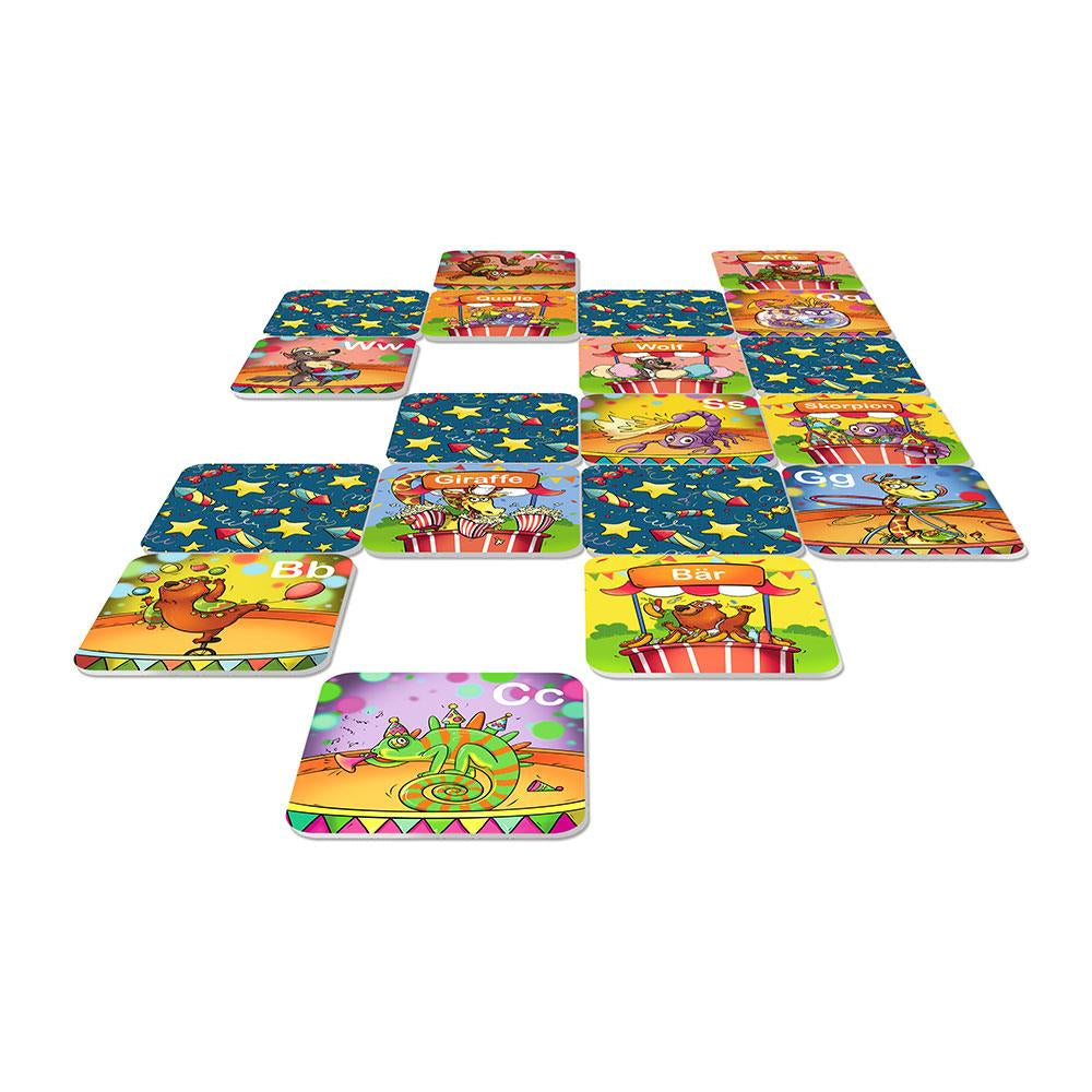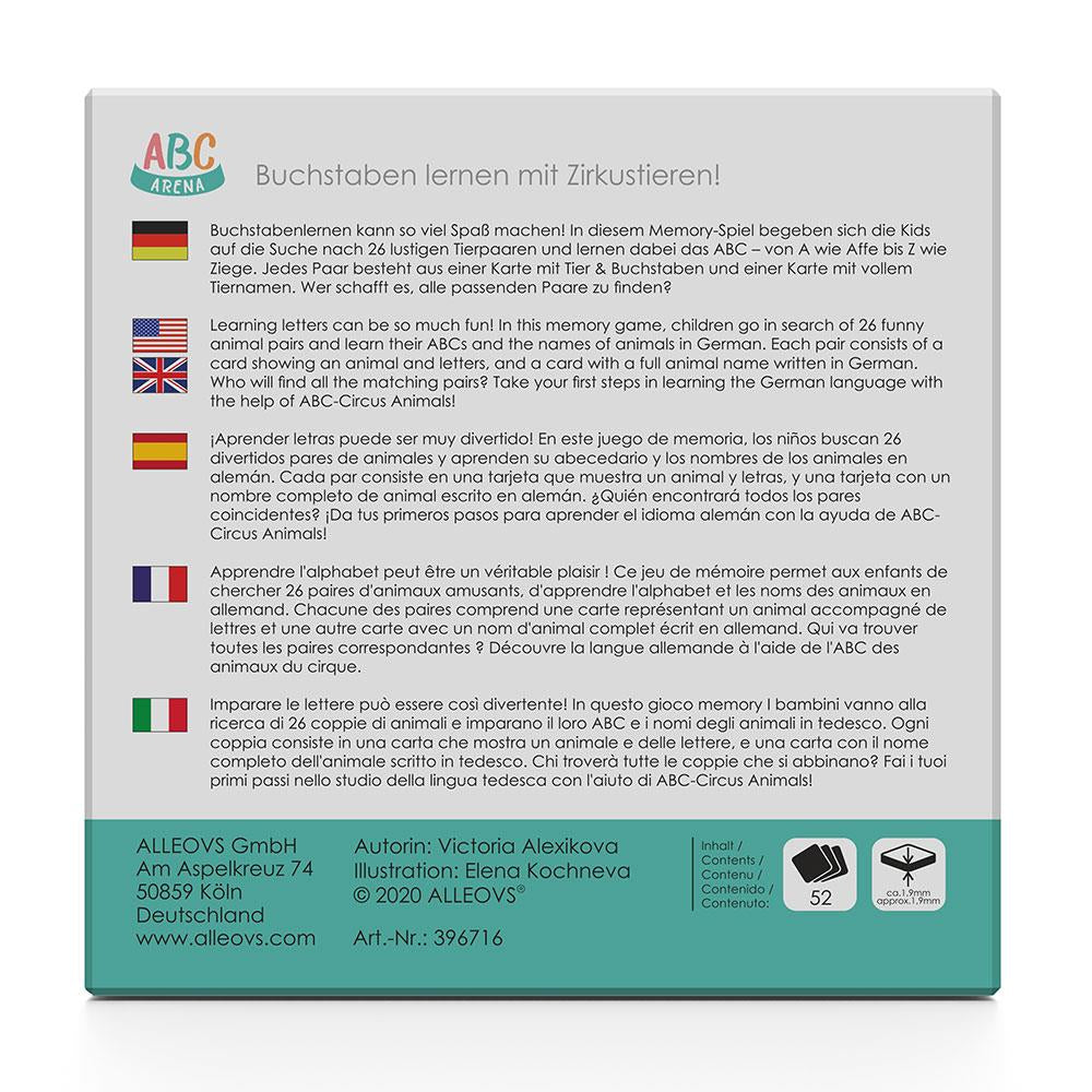 ABC Arena Buchstabenlernen kann so viel Spass machen! In diesem Memo-Spiel begeben sich die Kids auf die Suche nach 26 lustigen Tierpaaren und lernen dabei das ABC – von A wie Affe bis Z wie Ziege. Jedes Paar besteht aus einer Karte mit Tier & Buchstaben und einer Karte mit vollem Tiernamen. Wer schafft es, alle passenden Paare zu finden?