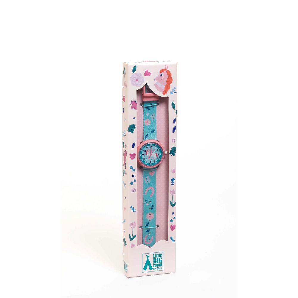 Djeco Armbanduhr Pferd Mit den lustigen Quarzuhren von Djeco können Kinder spielerisch die Uhr ablesen. Jede der verschiedenen Uhr hat ein Polyester Armband mit farbigen Details und eine Dornschliesse aus Metall. Die Quarzuhren sind Spritzwasserdicht und hat 2 Jahre Garantie. Masse Uhr: Durchmesser 3cm, Länge 20cm.
