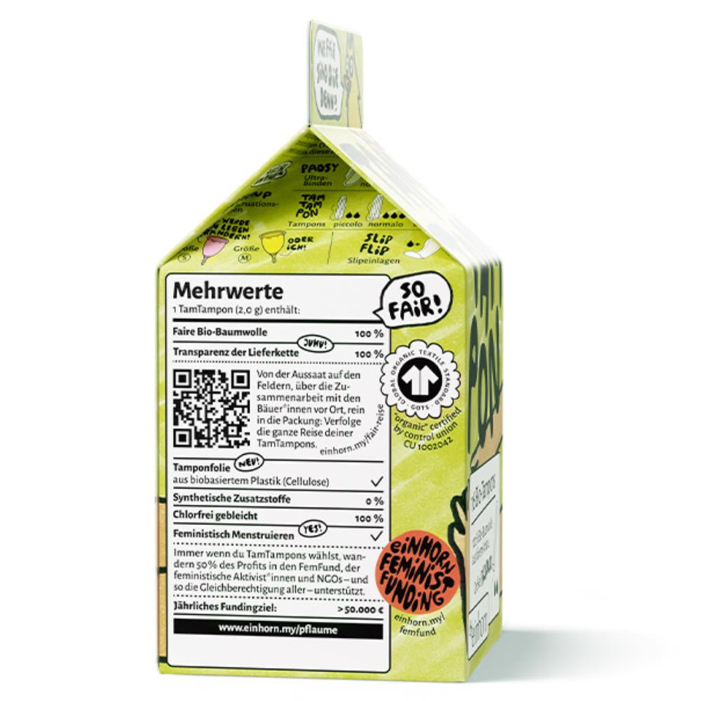 einhorn Bio-Tampons TamTampon, piccolo, 16 Stk Du solltest wissen, dass es sich bei den Bio-Tampons TamTampon um eine besondere Spezies unter den Menstruationsprodukten handelt. Leise und diskret war gestern – es muss rappeln und krachen! Das geht, in dem du die Packung vor dem Öffnen gut schüttelst. Schliesslich sind die TamTampons im Auftrag der Periode unterwegs und das soll jeder hören! Es gibt sie in den Grössen piccolo, normalo und super! Die Piccolos sind ideal für eine schwächere Blutung und obwohl es die kleinste Grösse in unserem TamTampon-Trio Grande ist, beinhaltet die Packung nicht nur 16 Bio-Tampons, sondern ist bis oben hin mit Amore gefüllt. Vive le menstruazioni! Und alle sind aus 100 % feiner Bio-Baumwolle. Hier erfährst du alles über das Innere (Gefühls-)Leben unserer Tamtampons. Die 3 goldenen Tamtampon-Regeln: Vor dem Verwenden Hände waschen. (sehr schlau) Immer die kleinstmögliche Grösse für deine jeweilige Blutungsstärke verwenden. (auch schlau) Tamtampons alle 4-8 Stunden wechseln. (boah, richtig schlau) Eine Packung enthält: 36 Gramm Tampons (16 Stück) Alle Tampons Grösse piccolo Einzeln verpackt 1 Gebrauchsanleitung 100% zertifizierte Bio-Baumwolle kühl und trocken lagern hypoallergen und saugfähig Designed in Berlin with love