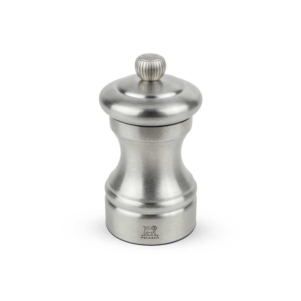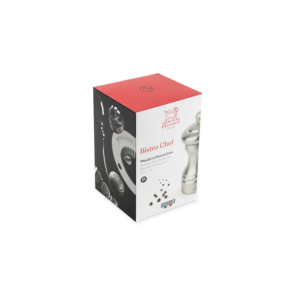 Peugeot Bistro Chef Pfeffermühle, 10 cm Die Pfeffermühle BISTRO Chef war die erste Pfeffermühle aus dem Hause Peugeot. Im Jahre 1874 wurde sie unter dem Namen Model Z entwickelt. Beim Relaunch dieser Ikone greift der Hersteller jetzt auf ein klassisches Material zurück: Die neue Pfeffer- und Salzmühle BISTRO CHEF besteht aus hochwertigem gebürstetem Edelstahl mit mattem Finish. Damit erscheint sie in einem stylishen, absolut zeitgemässen Design, das gleichzeitig Erinnerungen an die Tradition der Manufaktur wachruft und perfekt die Weltmarke Peugeot symbolisiert. Damit nicht genug: Auch In Bezug auf die Mahlleistung, die Robustheit und die Langlebigkeit bei härtesten Einsatzbedingungen wird sie auch den anspruchsvollsten Anwendern gerecht. Sie ist unempfindlich gegen Hitze, Kälte und Stösse und kann dank dieser Eigenschaften lange Zeit in der Gastronomie wie in privaten Haushalten zuverlässig ihren Dienst tun. Der Buchstabe P oder S auf dem Mühlenkörper zeigt an, ob sie für Pfeffer oder für Salz gedacht ist. Wie von Peugeot gewohnt, wird auch bei diesem noblen Modell eine 25jährige Garantie auf das Peugeot-Mahlwerk und zwei Jahre Garantie auf Korpus, Lackierung und Motoren eingeräumt.