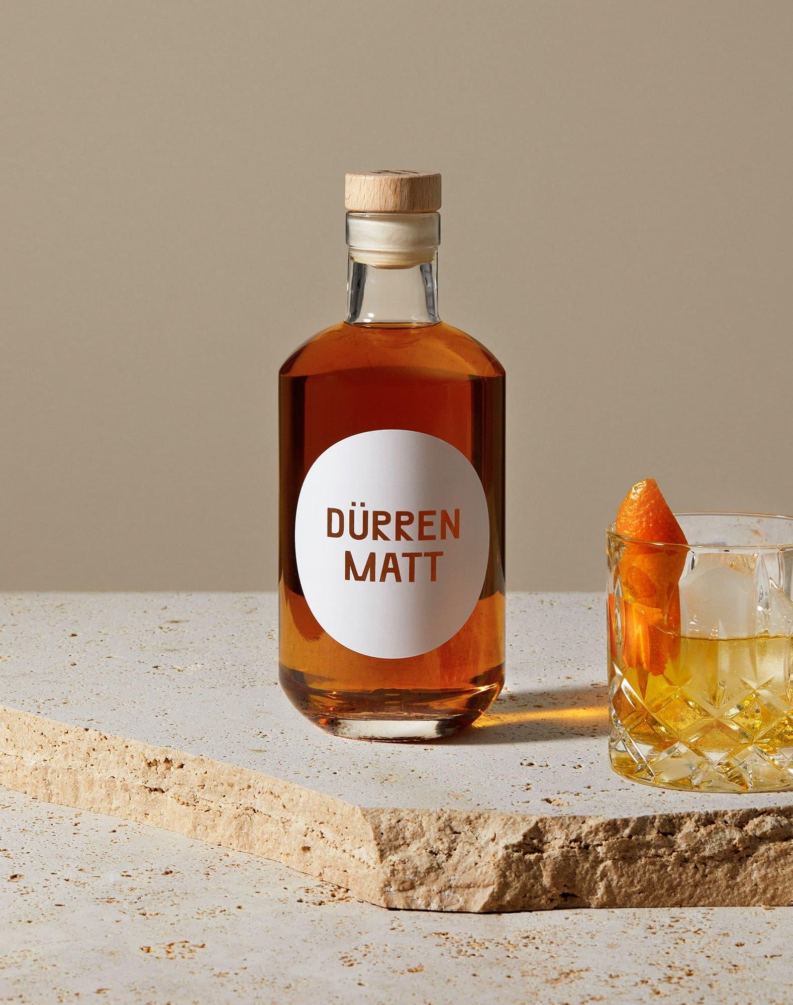 Den Dürrematt in einem Tumbler mit Eis verrühren und mit einer Orangenzeste garnieren.