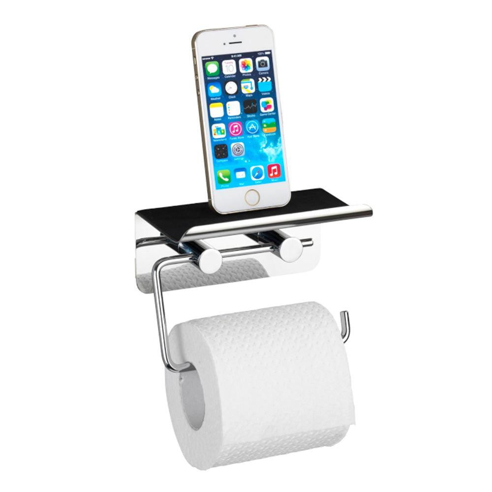 Wenko Edelstahl Toilettenpapierhalte, r mit Ablageglänzend Aus hochwertigem Edelstahl. Mit praktischer Ablage für Smartphones, Tablets uvm. Rutschhemmend beschichtet. Inkl. doppelseitigem Klebeband zum Befestigen ohne bohren. 14 x 7 x 11,5 cm
