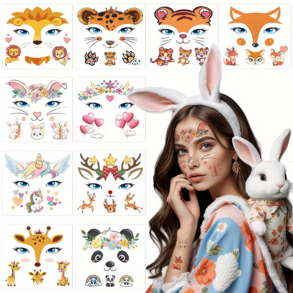 Werde, wer du sein willst! Mit 10 Bögen voller fantastischer Gesichts-Tattoos sind deiner Fantasie keine Grenzen gesetzt. Brülle heute als mutiger Löwe, strahle morgen als magisches Einhorn oder schleiche als schlauer Fuchs umher. Perfekt für Fasching, Geburtstage oder einfach zum Spass. Hautfreundlich, kinderleicht aufzutragen und ganz einfach wieder zu entfernen. Hol dir den Verwandlungsspass ohne klebrige Schminke! 10 Bögen (11 x 12 cm)