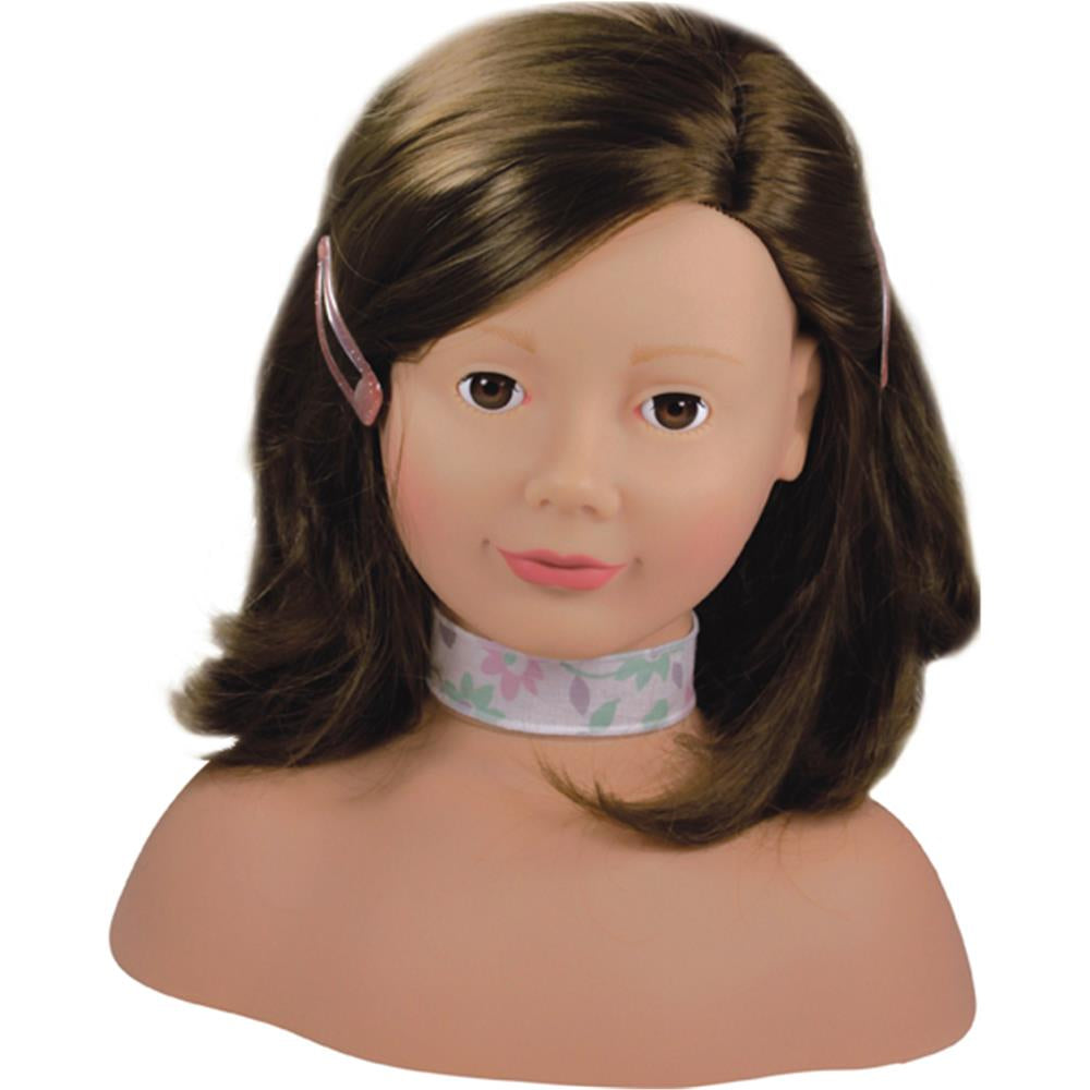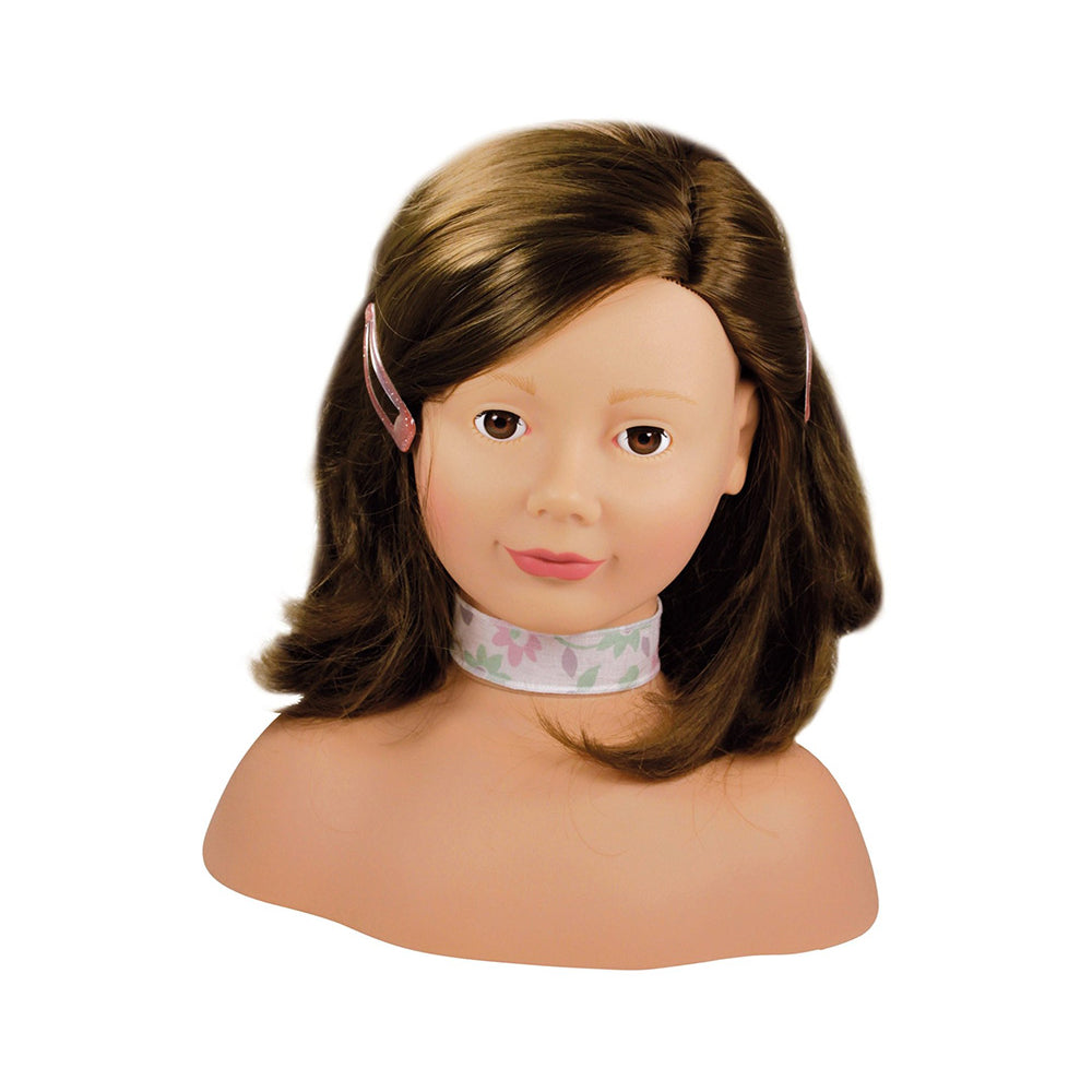 Götz Frisier- und Schminkkopf, braun Schminkkopf, braunes Haar und braune Augen Hier kannst du nach Lust und Laune frisieren und schminken. Wenn es dir nicht mehr gefällt, dann kreierst du einfach einen neuen Style. Das hochwertige Haar lässt sich gut frisieren und ist strapazierfähig. Mit dem reichhaltigen Set aus Spangen, Haarklammern und -gummis, Haarsträhnen und Schminke hast du unendlich viele Möglichkeiten. Am Abend, wenn du ins Bett gehst und dich vorher wäschst, nimmst du auch dein Haarwerk zum Abschminken mit. Denn auch sie möchte ein sauberes Gesicht über Nacht haben. So wird es dir lange Freude bereiten. NEU Beinhaltet nun Styling-DVD! Verschiedene Frisuren werden vorgestellt – Nachmachen dringend erwünscht. Viel Spass! Tipp Sollte dennoch mal etwas Schminke am Kopf sein, dann ein klein wenig Speiseöl oder Fettcreme auf einen Wattebausch nehmen und damit das Gesicht abschminken. Danach noch mal waschen und der Puppenkopf ist wieder schick. Der Kopf ist mit Saugnäpfen ausgestattet, so dass er beim Frisieren nicht verrutschen kann. (Nur auf glatter Oberfläche gewährleistet) Set bestehend aus 58 Teilen. Höhe: ca. 28 cm, Schulterbreite: ca. 25 cm