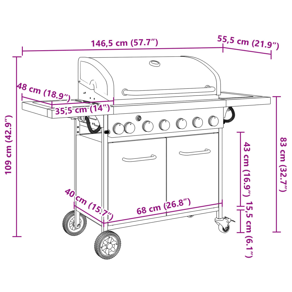 Dieser Gasgrill ist mit 7 Flammen ausgestattet und eignet sich daher perfekt, um Familie und Freunde mit Grillspeisen zu verwöhnen. Stabiles und langlebiges Gestell: Stahl ist stark, stabil und langlebig, was ihn zur idealen Wahl für eine Vielzahl von Anwendungen macht, von der Möbelherstellung bis hin zum Bauwesen.Großzügige Grillfläche: Der Outdoor-Grill verfügt über eine großzügige Grillfläche und die seitlichen Ablagen bieten zusätzlichen Platz für die Zubereitung von Saucen oder Lieblingsbeilagen.Praktisches Design: Dank der flexiblen Räder lässt sich der Gasgrill leicht transportieren und umstellen. So kannst du überall Grillspeisen zubereiten.Zusätzlicher Stauraum: Das untere Fach bietet reichlich Platz für die Aufbewahrung von Küchenutensilien oder Grillwerkzeugen.Piezozündung: Dank des Piezo-Zündsystems lässt sich der Grill auf Knopfdruck schnell und zuverlässig anzünden.Eingebautes Thermometer: Ein genaues Thermometer ist in der Haube des Grills eingebaut und sorgt dafür, dass das Grillgut stets perfekt zubereitet wird. Gut zu wissen:Zum Anschluss des Grills an eine Gasflasche sind ein Gasschlauch und ein Druckregler erforderlich, die nicht im Lieferumfang enthalten sind. Achtung:Der Grill wird während des Gebrauchs sehr heiß. Bewegen Sie es NICHT während des Gebrauchs!Niemals Gasflaschen in das Ablagefach oder unter den Grill stellen.