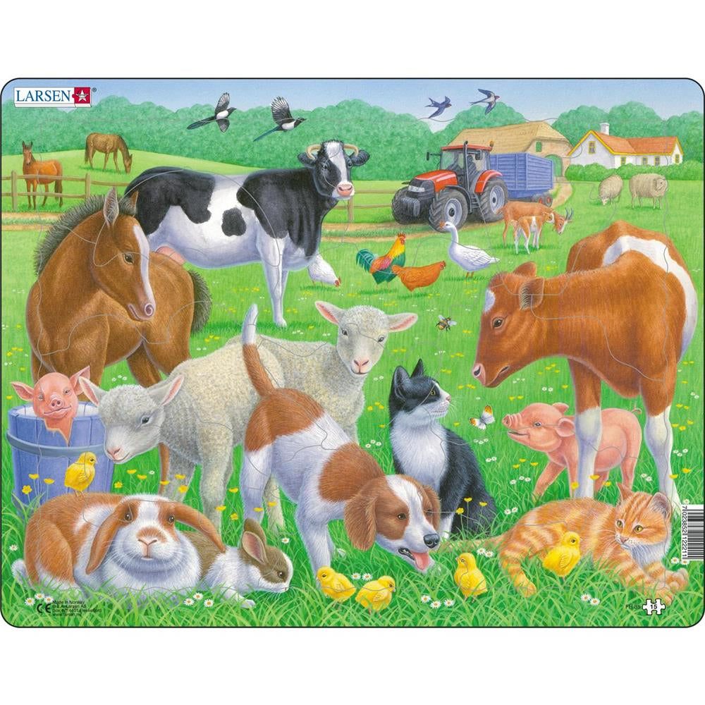 Larsen Puzzle Haus- und Nutztiere, 15 Teile Ein Bauernhof kann ein lebendiger Ort sein, an dem Sie alle Arten von Haustieren und Tieren finden können. Glückliche Hunde mischen sich mit mehreren Katzen und anderen größeren Nutztieren. Können Sie das Schweinebaby sehen, das in dem blauen Holzeimer spielt? Ein Bauer fährt mit seinem Traktor, während über ihm mehrere Vögel in der Luft fliegen. Eine spielerische Hummel schwirrt um den Kopf eines Kalbes, und ein Stier beobachtet die Gruppe. Pferde grasen auf dem grünen Gras dahinter, und Kaninchen genießen den kühlen Boden. Wie viele Kükenbabys findet man in der Tiergruppe? L: 36.6 x B: 28.3 x H: 0.4 cm