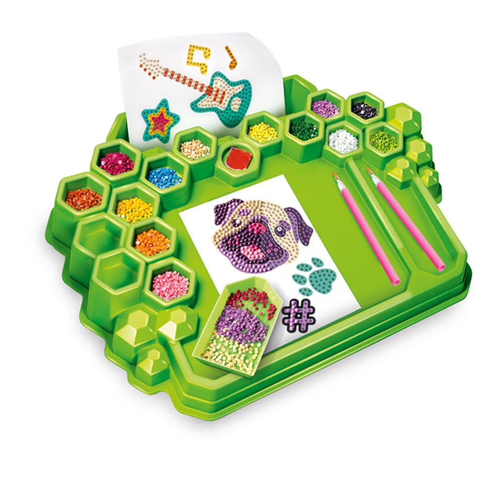 Idea Sparkly Creation. Farbenfrohe, glitzernde Edelsteine zur Herstellung edler 3D-Sticker. Eine einfache und moderne Technik, um trendige Sticker zu kreieren, mit denen man Taschen, Schulranzen, Hefte und vieles mehr verschönern kann. Eine moderne und kreative Aktivität, um die Konzentration zu verbessern und die manuelle Geschicklichkeit zu testen, um die Hände und den Kopf zu trainieren! Alles, was Sie brauchen, um Ihren eigenen Arbeitsplatz einzurichten, Ihren Raum zu organisieren und mit der Arbeit zu beginnen. Die Arbeitsfläche bietet Platz für die zu bearbeitenden Blätter, die Werkzeuge und die nach Farben geordneten Edelsteine.