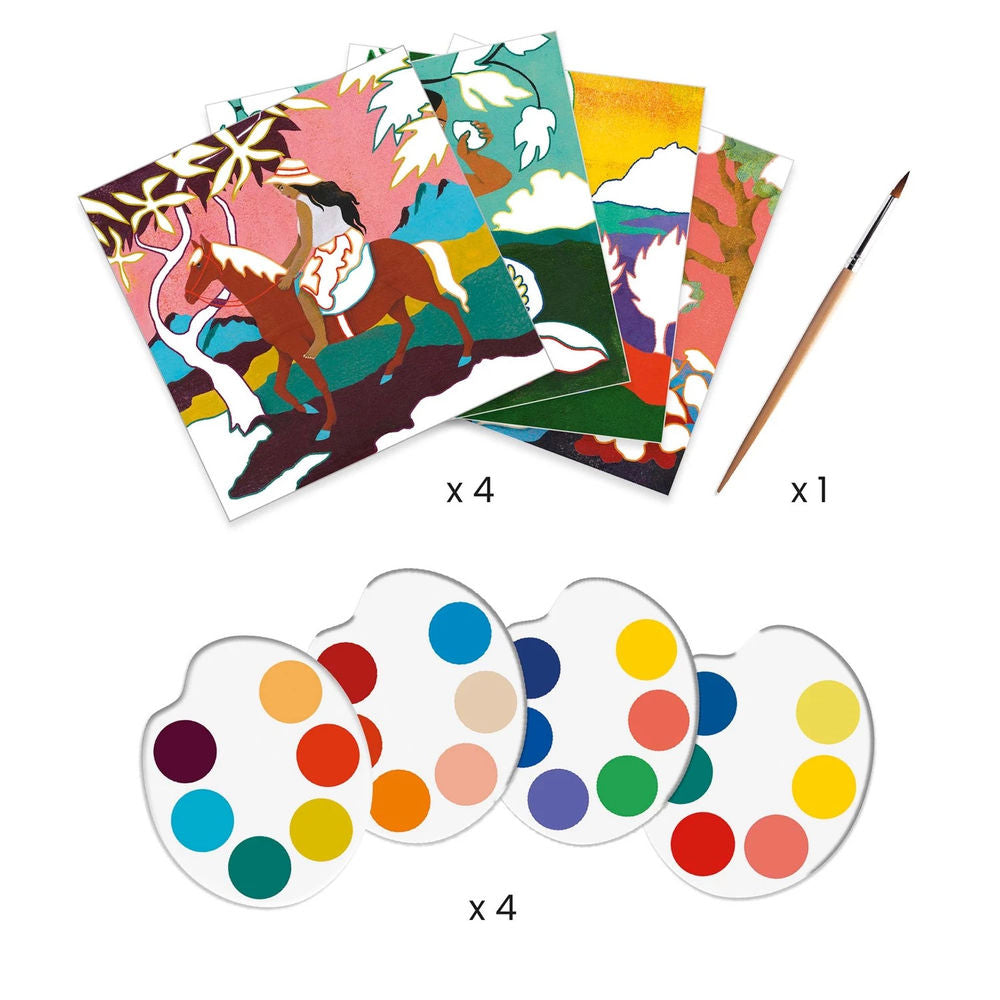 Djeco Inspired by Polynesia Eine Malset, das Sie dazu einlädt, den Malstil von Paul Gauguin, dem grossen post-impressionistischen Meister, zu entdecken. Nach und nach werden die Bilder in Farbe getaucht und die Tahitianerinnen erwachen zum Leben.
