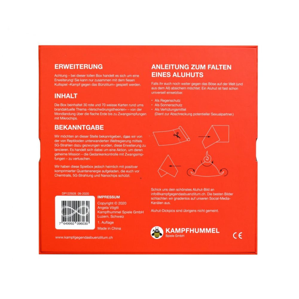 Kampfhummel Kampf gegen das Bünzlitum - Aluhut-Erweiterung Wir nehmen uns in der Aluhut-Erweiterung den brandaktuellen Verschwörungstheorien und Esoterik-Trends an. Ob Echsenmenschen, Bill Gates, 5G oder Zwangsimpfungen mit Mikrochips - wir haben sie alle.