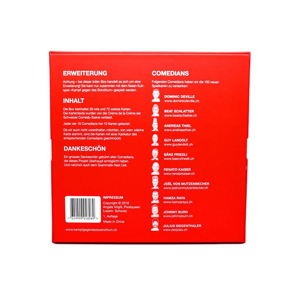 Kampfhummel Kampf gegen das Bünzlitum - Comedy-Erweiterung Für das Comedy-Erweiterungsset haben zehn Schweizer Comedians je zehn neue Karten verfasst: Dominic Deville, Beat Schlatter, Andreas Thiel, Guy Landolt, Bänz Friedli, Renato Kaiser, Joël von Mutzenbecher, Hamza Raya, Johnny Burn, Julius Siegenthaler.