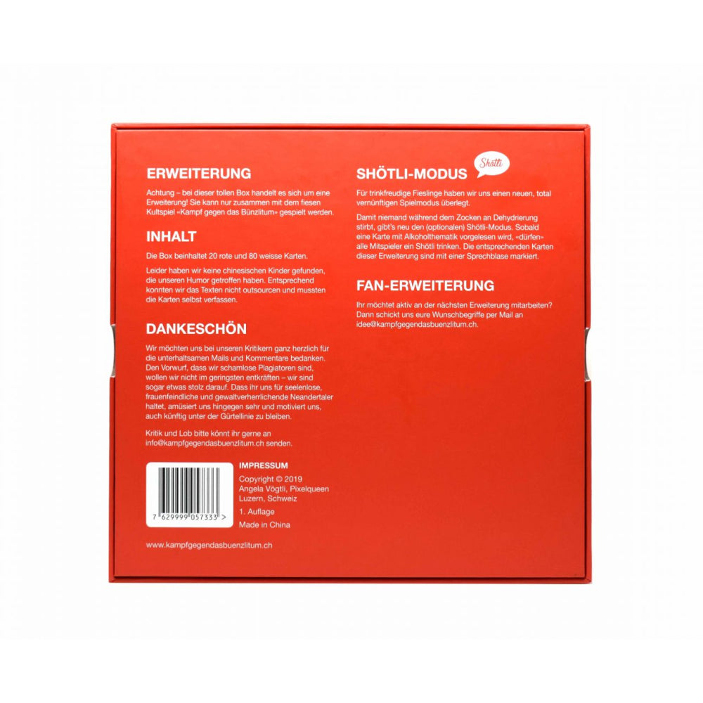 Kampfhummel Kampf gegen das Bünzlitum - Shötli-Erweiterung Die Karten der Shötli-Erweiterung handeln vom aktuellem Zeitgeschehen, Persönlichkeiten und ... Alkoholthematiken. Deshalb haben wir auch den neuen, total vernünftigen Spielmodus für trinkfreudige Fieslinge eingeführt.