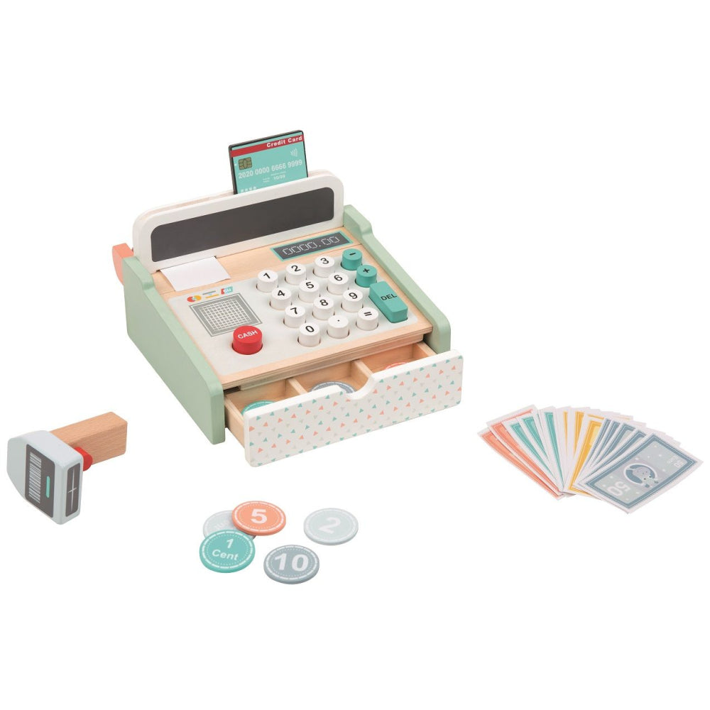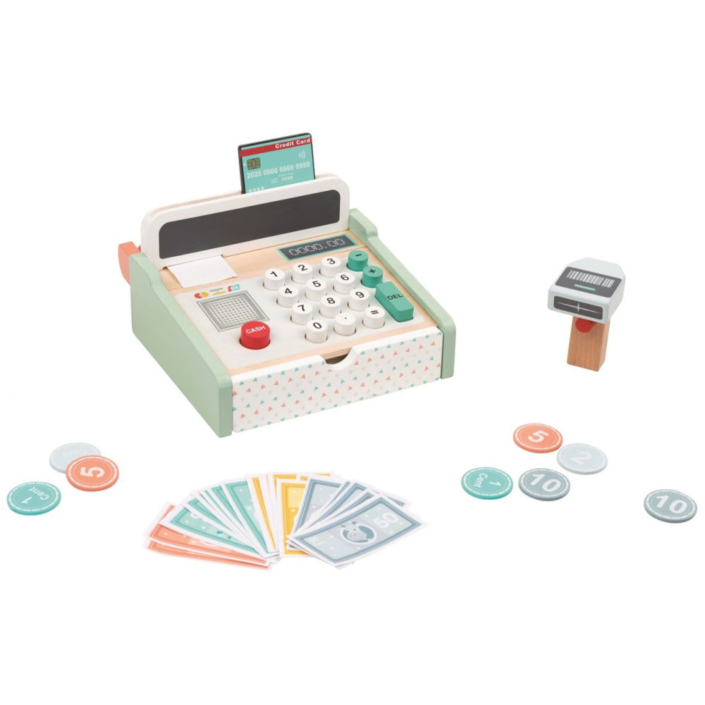 Kasse mit Scanner + Holzrechner Stabile Holzkasse mit integriertem Holzrechner, Spielgeld, Scanner, Papierrolle und Schublade. Tolle Holzverarbeitung und schöne Lackierung. Hergestellt aus ökologischem Kautschukholz.