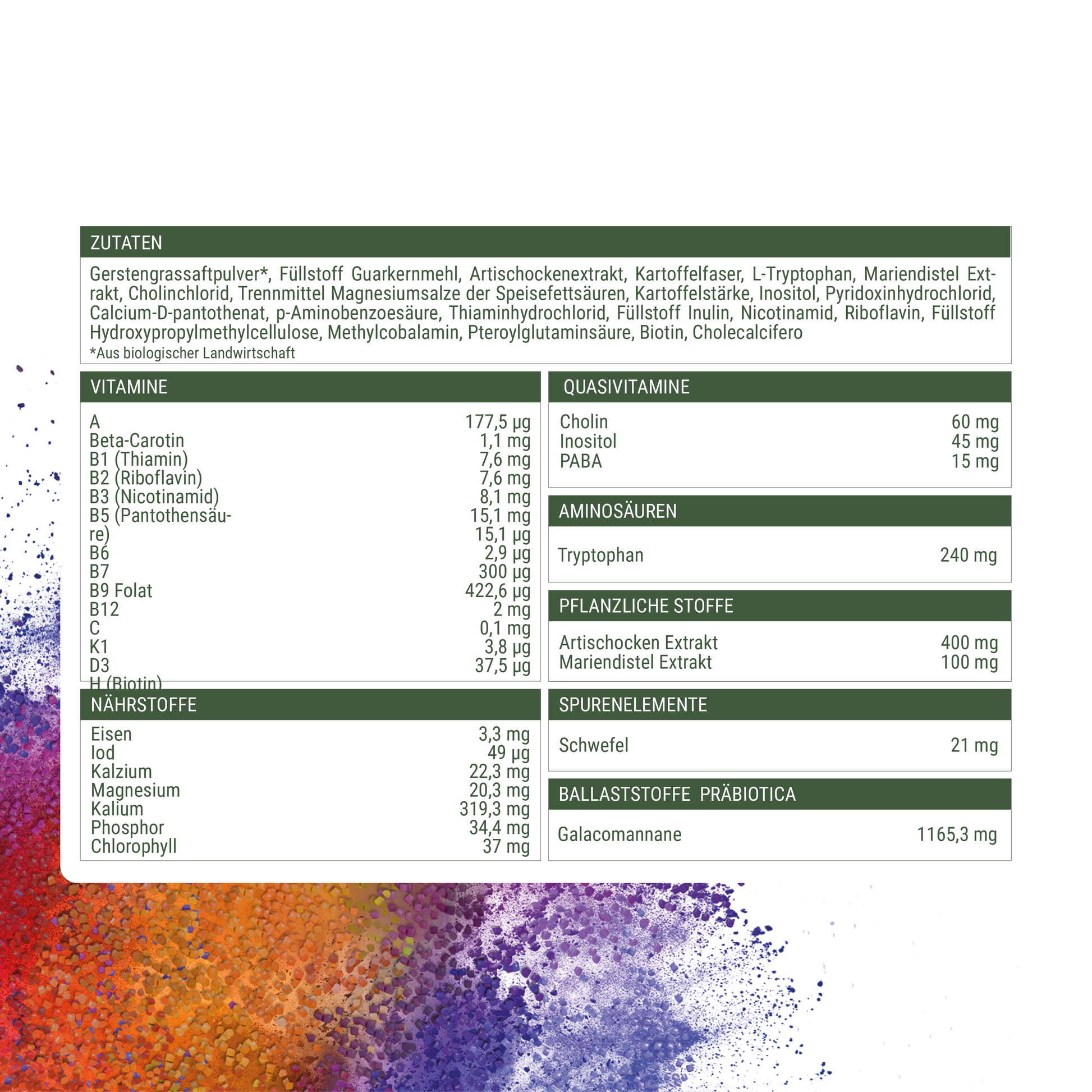 - Mit Cholin, Vitaminen, Mineralstoffen, Pflanzenstoffen auf Basis von BIO Gerstengrassaftpulver