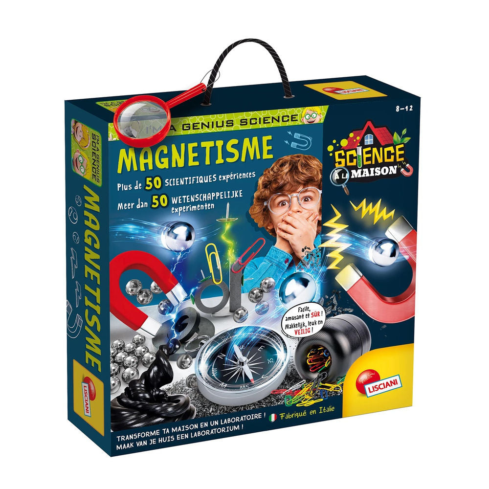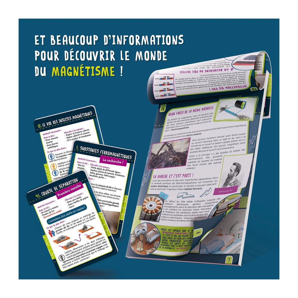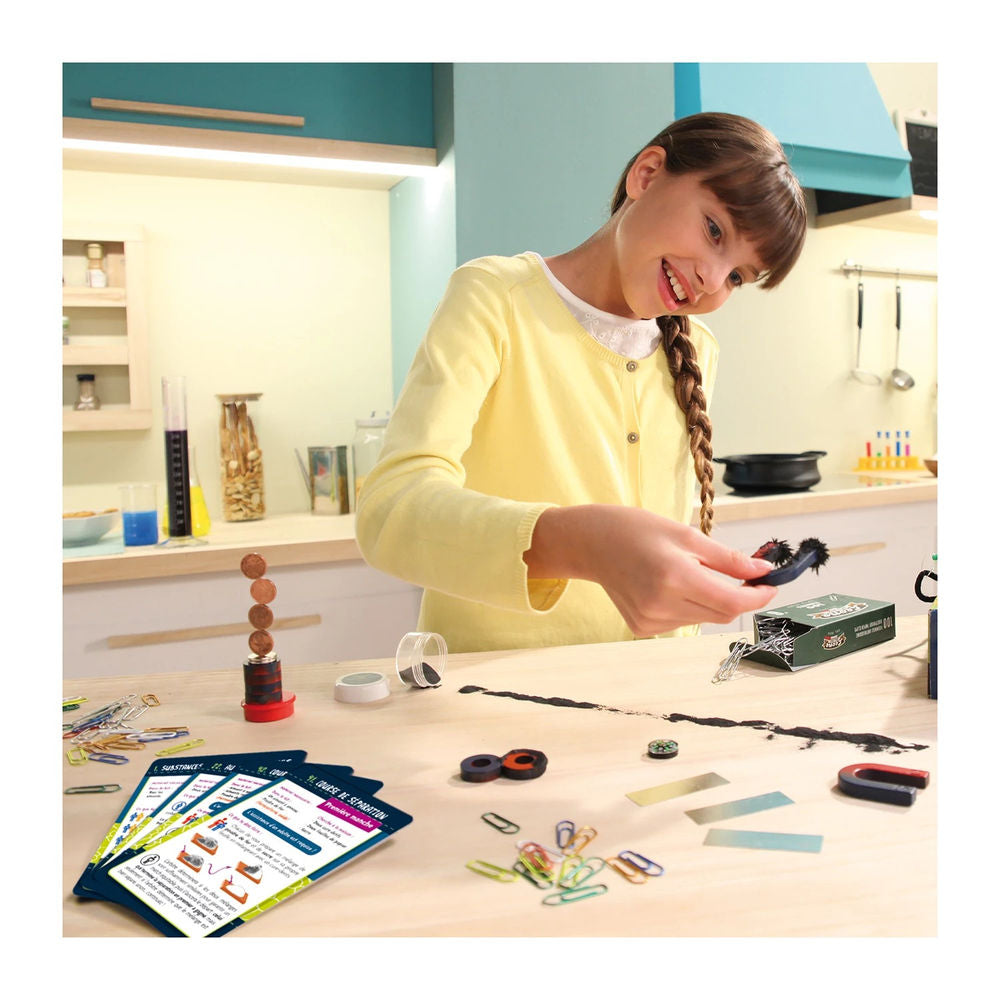 Ce kit scientifique permet de découvrir le phénomène du magnétisme, du champ magnétique et des pôles opposés. De nombreuses expériences simples et sûres qui peuvent être réalisées avec des objets simples. Le kit contient des aimants et de la poudre de fer, un manuel illustré et un bras de loupe exclusif.