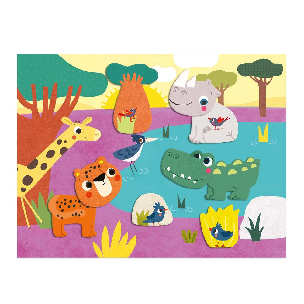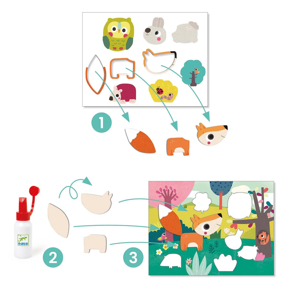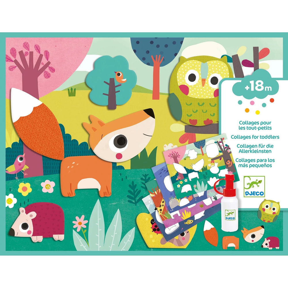 Djeco Meine erste Collage Ein erstes Collageset für die Allerkleinsten ab 18 Monaten. Dicke Formen, die sich leicht ablösen lassen, um sie auf hübschen Illustrationen aufzukleben und 4 Bilder zu gestalten.