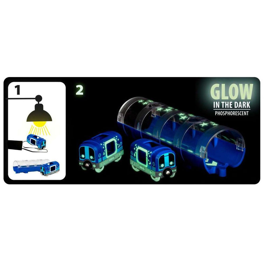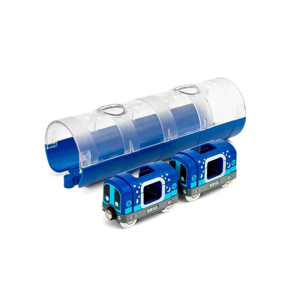 Mach das Licht aus, damit die Tunnel Box und die U-Bahn im Dunkeln leuchten. Dieses Zug-Set besteht aus einer zweiteiligen U-Bahn und einem speziell gestalteten Tunnel, die beide im Dunklen leuchten. Die Lok und der Passagierwaggon können über die Magnetverbindungen miteinander verbunden werden und bieten an Bord genügend Platz für zwei bewegliche BRIO World Figuren.