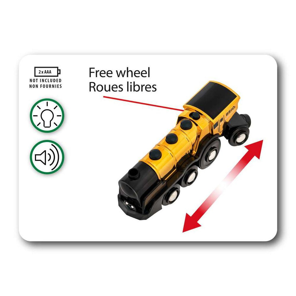 Mit ihrem glänzend goldenen, metallischen Lack und dem klassischen Tuut-tuut!-Geräusch beeindruckt die Goldene Batterielok mit Licht und Sound alle, während sie mit rasendem Tempo über die Schienen saust. Das Kind kann mit dem Schalter am Führerhaus das Getriebe auskuppeln und die Lok somit ohne Batteriefunktion vorwärts- und rückwärts schieben. Diese Lok im Retrodesign unterstützt die Entwicklung des Kindes, indem logisches Denken und die feinmotorischen Fähigkeiten gefördert werden.