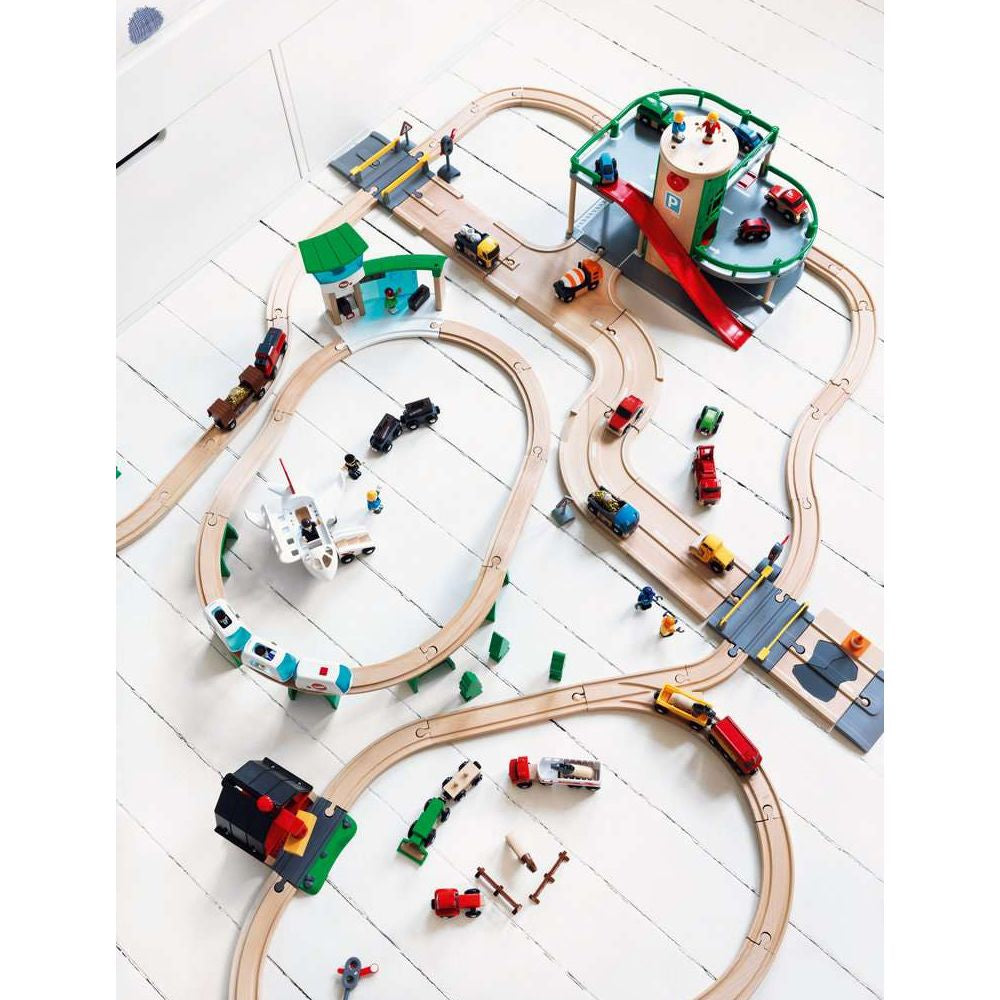 Vereine die Schienen- und Straßenwelt in diesem einzigartigen Parkhaus und baue sie weiter aus. Mit Fahrstuhl, steiler Ausfahrt und Tankstelle. Verlade ein Auto per Knopfdruck direkt von Ebene 2 auf einen bereitstehenden Eisenbahnwaggon.