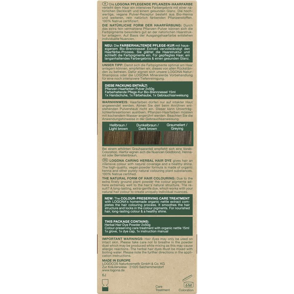 Logona Pflanzenhaarfarbe Pulver - Aschbraun, 100 g Das Farbergebnis der LOGONA Pflanzen-Haarfarben basiert auf Ihrer Ausgangshaarfarbe. Damit diese Nuance dem gewünschten Farbton entspricht, empfehlen wir, vor der Anwendung eine Probesträhne zu färben. HINWEIS: Pflanzen-Haarfarben entwickeln ihre volle Farbkraft erst nach ca. 48h; vor allem die Braun- & Schwarztöne dunkeln in dieser Zeit nach. Achten Sie auf die Farbempfehlung der Anwendungstabelle. Haarfarben dürfen nur auf intakter Haut angewendet werden. Atmen Sie den beim Anrühren evtl. entstehenden Pulverstaub nicht ein. Dieser kann Unverträglichkeitsreaktionen auslösen. Pflanzen-Haarfarben müssen mit kochendem Wasser angerührt werden.