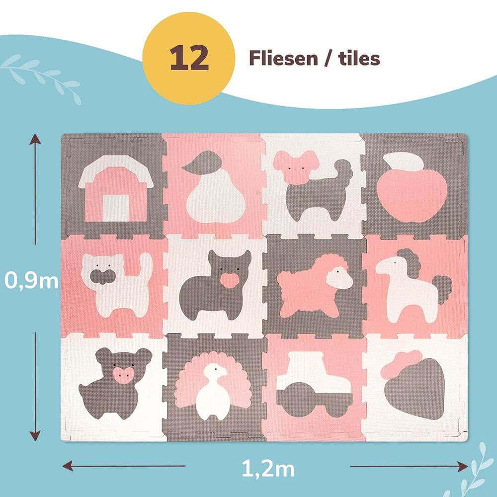 Hakuna Matte Puzzlematte, Bauernhof, 1.2 m x 0.9 m Die farbenfrohe Puzzlematte «Bauernhof» von Hakuna Matte bietet deinem Kind nicht nur angenehmen Schutz beim Spielen am Boden, sondern hilft auch, Farben und Formen kennen zu lernen. Die Matte ist 20% dicker als Vergleichsprodukte. Materialien, welche frei von BPA und Phthalaten sind, machen die Matte für dein Kind absolut sicher. Die Kanten der einzelnen Matten erlauben es auch, kreative Objekte zu bauen. Dafür werden die Elemente einfach winklig zusammengefügt. Hilf deinem Kind, die Welt neu zu entdecken - egal ob beim Zusammensetzen der zweidimensionalen Matte oder beim Bauen eines dreidimensionalen Hauses. LUSTIGE PUZZLEMATTE mit Tieren beschäftigt Ihr Kind mit Spielen, Krabbeln und Lernen von Farben und Formen. +20% DICKERE Krabbelmatte wird aus dem hochwertigen EVA-Schaumstoff gefertigt. TÜV SÜD GS ZERTIFIZIERT - Spielteppich ist 100% sicher: schadstofffrei, geruchlos, Formamid-, BPA- und Phthalatenfrei. 4 ÖBERFLÄCHENTYPEN für die Entwicklung der motorischen Fähigkeiten des Babys. Lernteppich mit nur 4 Hauptfarben: Rot, Grün, Blau und Gelb, die für einen Säugling oder ein Kleinkind leicht zu sehen und zu lernen sind. RECYCELBARER VERPACKUNGSKARTON - ist eine nachhaltigere Verpackungsalternative zu herkömmlicher Plastikfolie.