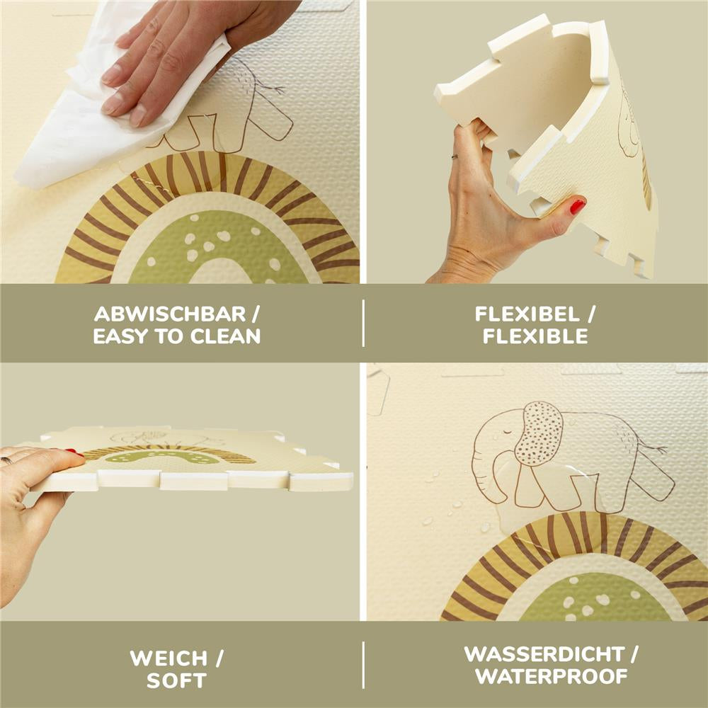 Hakuna Matte Puzzlematte, Safari Tiere, 0.9 m x 0.9 m Die dezente Puzzlematte «Safari Tiere» von Hakuna Matte bietet deinem Kind nicht nur angenehmen Schutz beim Spielen am Boden, sondern hilft auch, Farben und Formen kennen zu lernen. Die Matte ist 20% dicker als Vergleichsprodukte. Materialien, welche frei von BPA und Phthalaten sind, machen die Matte für dein Kind absolut sicher. Die Kanten der einzelnen Matten erlauben es auch, kreative Objekte zu bauen. Dafür werden die Elemente einfach winklig zusammengefügt. Hilf deinem Kind, die Welt neu zu entdecken - egal ob beim Zusammensetzen der zweidimensionalen Matte oder beim Bauen eines dreidimensionalen Hauses. Lustige Puzzlematte mit Tieren beschäftigt Ihr Kind mit Spielen, Krabbeln und Lernen von Farben und Formen. +20% DICKERE Krabbelmatte wird aus dem hochwertigen EVA-Schaumstoff gefertigt. TÜV SÜD GS ZERTIFIZIERT - Spielteppich ist 100% sicher: schadstofffrei, geruchlos, Formamid-, BPA- und Phthalatenfrei. UNENDLICH ERWEITERBAR - 2, 3 oder mehr Teppiche verzahnen sich makellos RECYCELBARER VERPACKUNGSKARTON - ist eine nachhaltigere Verpackungsalternative zu herkömmlicher Plastikfolie.