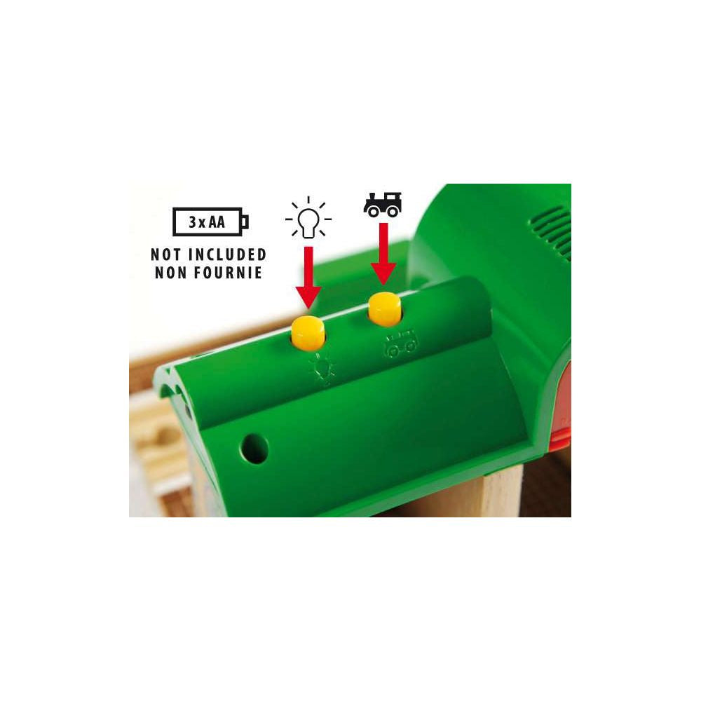 Nimm deine eigenen Durchsagen an die Reisenden auf. Es gibt Zuggeräusche, Licht, einen Fahrkartenschalter, ein Bahnhofsschild mit drehbarer Anzeige und Türen, die auf und zu gehen.