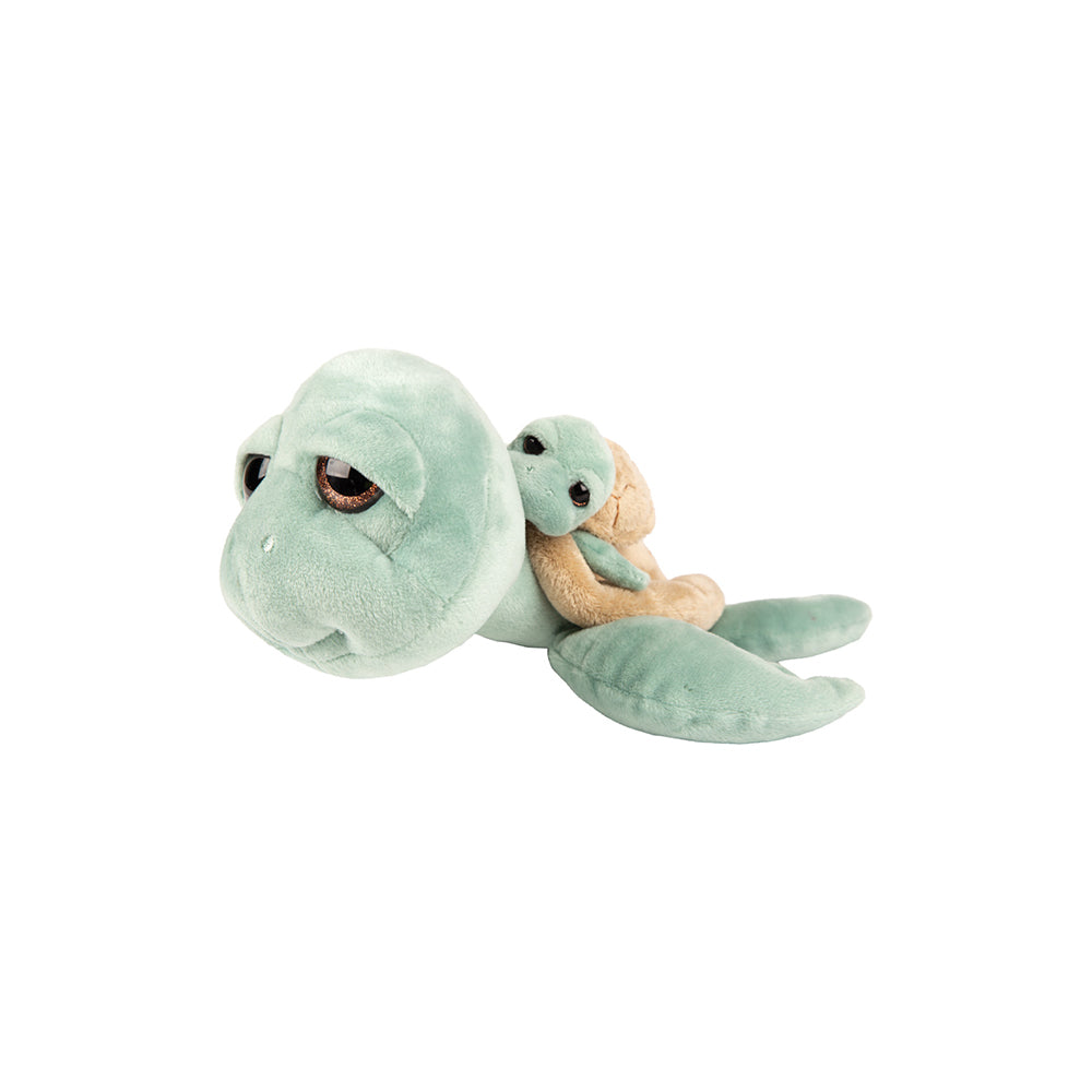 Suki Schildkröte grün 24cm mit Baby Schildkröte grün. Das kleine Baby steckt in einer Tasche im Panzer der Mama-Schildkröte und kann sogar rausgenommen werden. Drückt man dem Baby zudem auf den Bauch, quietscht es fröhlich.