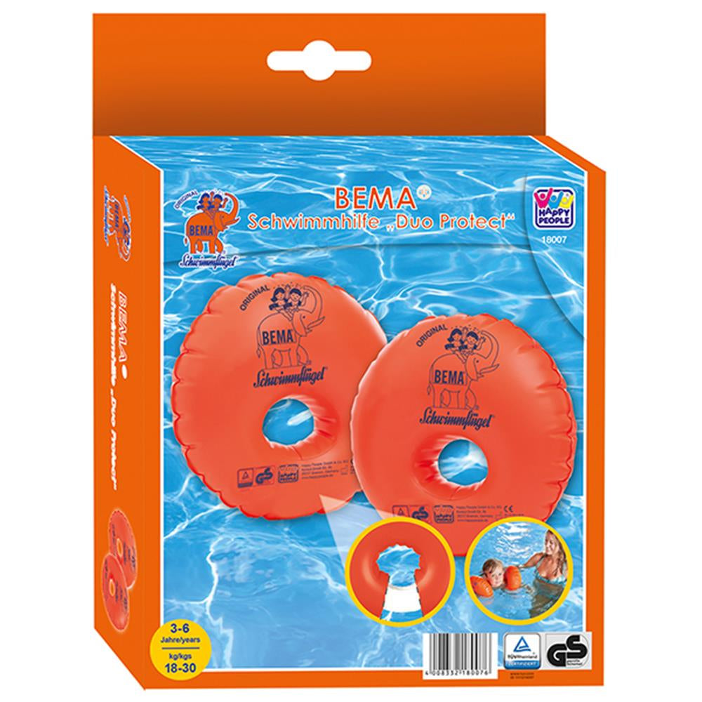 Bema Schwimmflügel rund mit Schaumstoffkern Durchmesser ca. 25 cm, mit Schaumstoffkern, für Kinder von 18 bis 30 kg, ab 3+ Jahren. BEMA Schwimmflügel mit integriertem Schaumstoffkern für höchste Sicherheit, sollte die Luft aus den zwei Kammern entweichen halten die zwei Schaumstoffkerne das Kind noch über Wasser. Aufgeblasen haben die BEMA Schwimmflügel eine Grösse von ca. 25 cm im Durchmesser. Achtung! Nur im flachen Wasser unter Aufsicht von Erwachsenen verwenden, Benutzung unter unmittelbarer Aufsicht von Erwachsenen. Farbe: Orange Gewicht: ca. 240 g