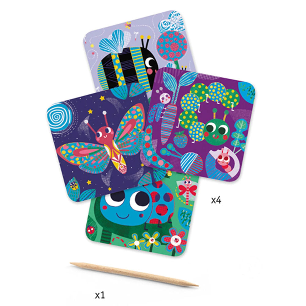 Djeco Scratchbilder Insekten Verschiedene Motive kommen zum Vorschein, sobald die Wachsschicht entfernt ist. Jedes Set enthält 4 Vorlagen, sowie einen Holzstab zum Kratzen. Eine tolle Beschäftigung, die keine Langeweile aufkommen lässt.