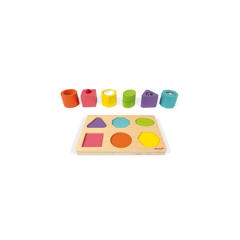 Janod Sortierspiel Formen und Bausteine mit Rassel, Spiegel, Sound, Glöckchen, usw. 20.3x7x13.5cm, FSC