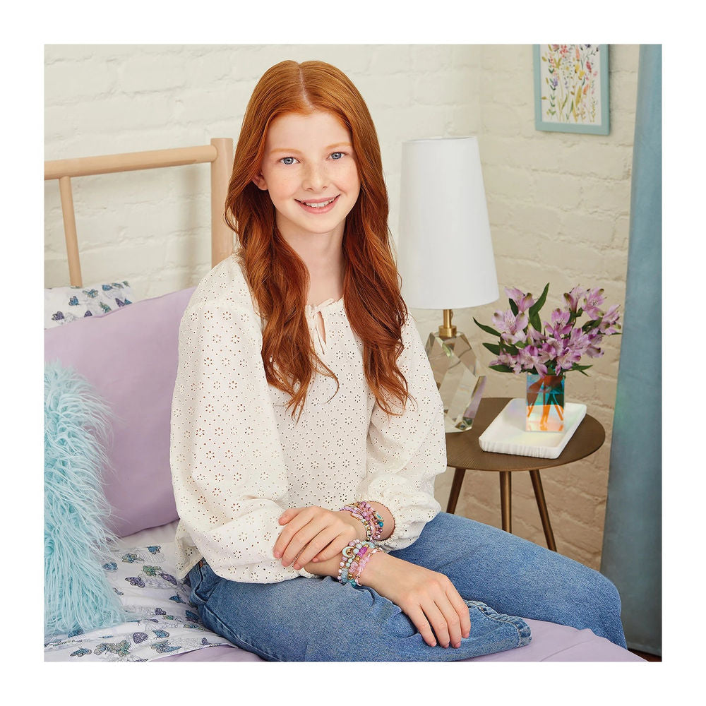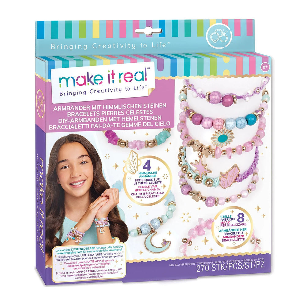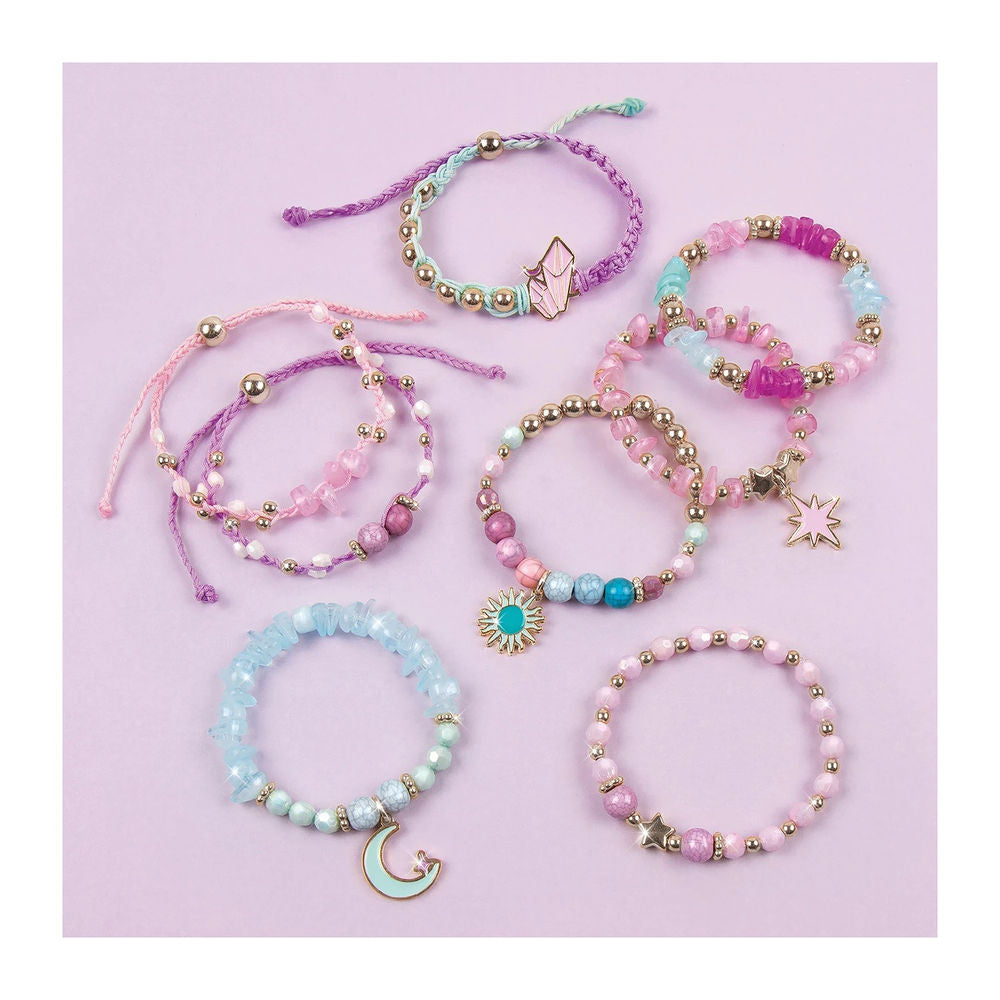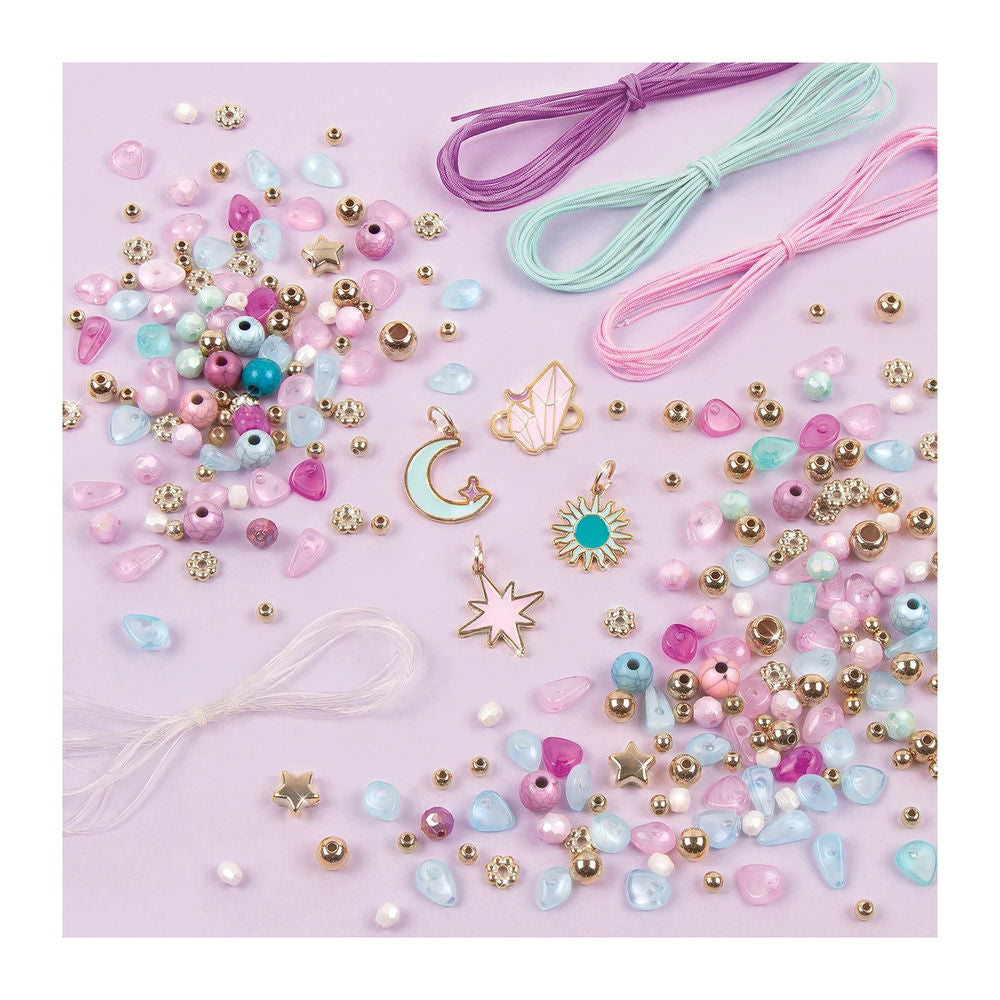 Set zum Herstellen von bunten Armbändern. Inhalt: 1 elastische Schnur, durchsichtig (2 m), 1 Nylonschnur (5 m),1 Nylonschnur (1,5 m), 1 Nylonschnur (3 m), 260 sortierte Perlen,4 Anhänger,1 Basteltablett,1 Anleitungsblatt.