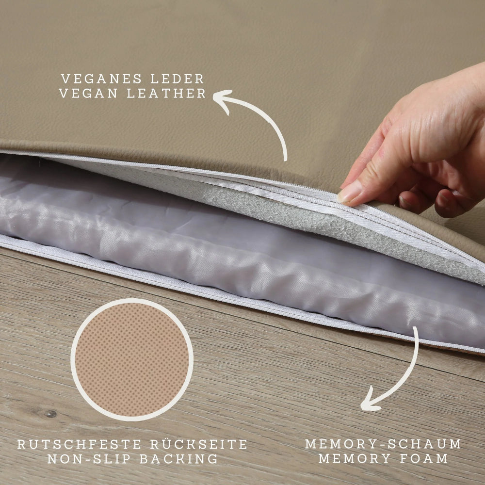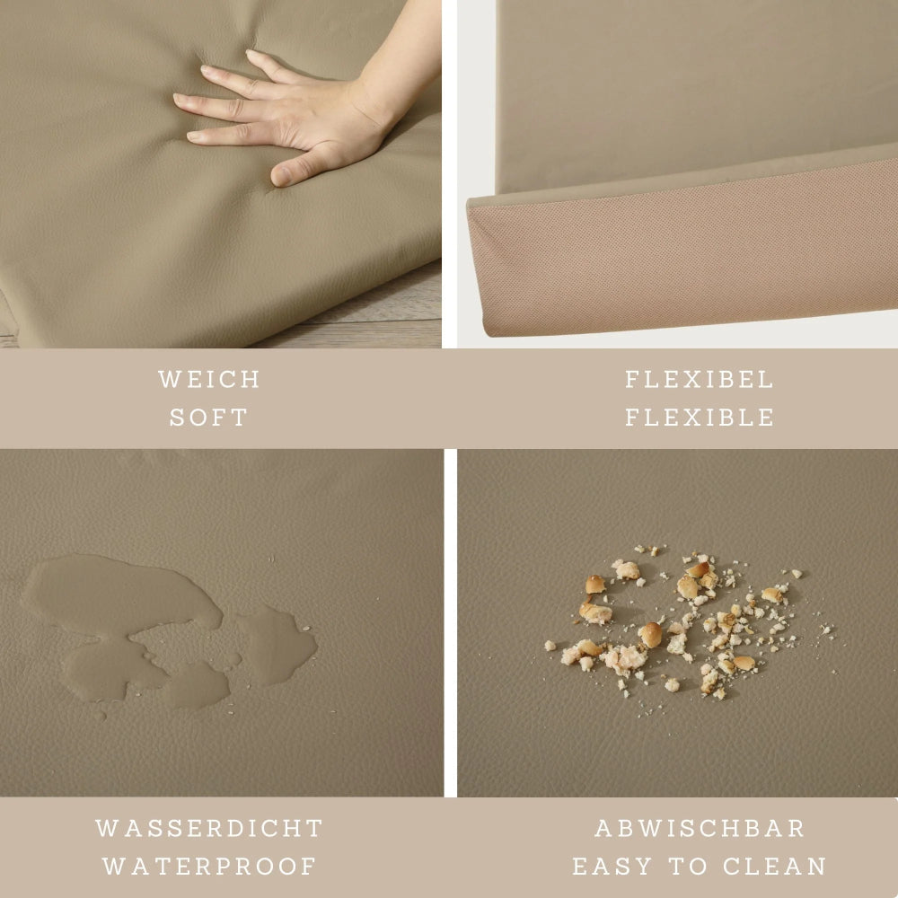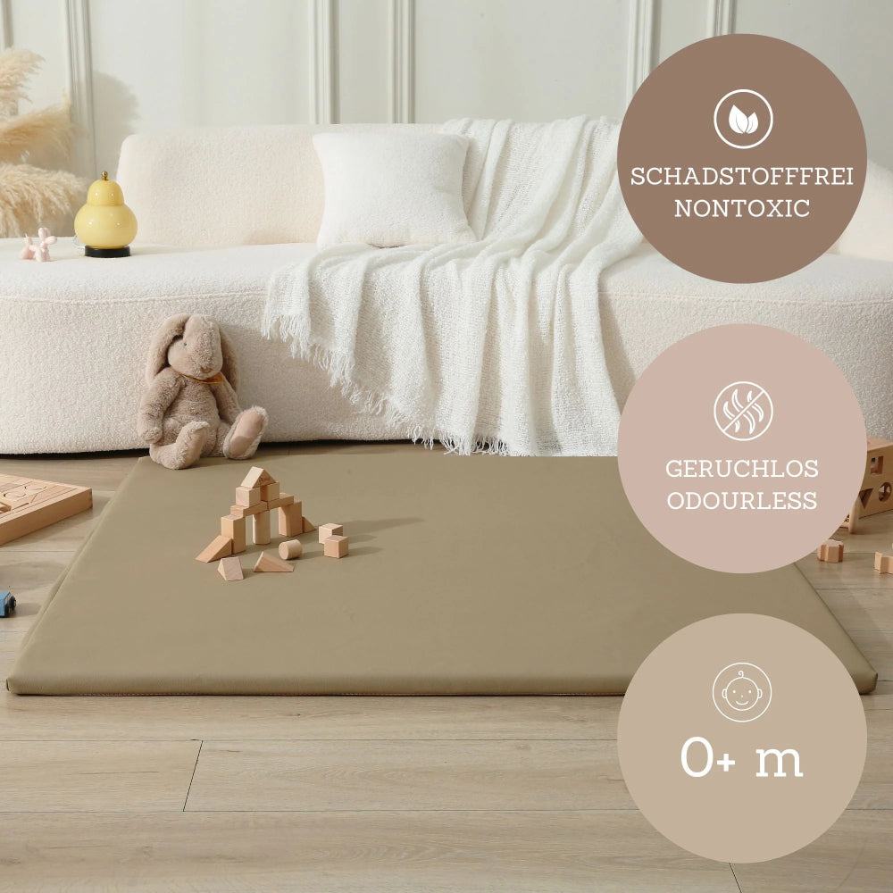Hochwertiges 3-Schicht-Design: Diese gepolsterte Spielmatte für Kinder kombiniert drei innovative Schichten: 1) Soft-Touch-Veganleder (EPU) für ein luxuriöses und sanftes Hautgefühl, 2) hochdichten Memory-Schaum für optimalen Komfort und Stabilität sowie 3) eine rutschfeste Unterseite für maximale Sicherheit. Mit grosszügigen Massen von 120 x 120 x 2,5 cm eignet sie sich ideal für Krabbeln, Bauchzeit, Yoga oder Home-Workouts. Stilvoll und vielseitig: Perfekt abgestimmt auf moderne Eltern, fügt sich diese Baby-Spielmatte harmonisch in jedes Wohn- oder Kinderzimmer ein. Die zarten Pastelltöne schaffen eine einladende Atmosphäre und machen die Matte zu einem eleganten Highlight in Ihrem Zuhause. Langlebig und einfach zu montieren: Gefertigt aus hochwertigem Memory-Schaum mit 2 cm Stärke, kehrt die Matte innerhalb von 1-2 Tagen in ihre ursprüngliche Form zurück - ein klarer Vorteil gegenüber günstigeren Alternativen. Die Montage ist unkompliziert: Legen Sie die Matte in den Bezug aus veganem Leder, schliessen Sie den Reissverschluss - und schon ist die Baby Krabbeldecke einsatzbereit. Sicher & kindgerecht: Hergestellt aus ungiftigen, umweltfreundlichen Materialien, erfüllt diese Babymatte höchste Sicherheitsstandards. Sie schafft eine sichere, beruhigende Umgebung für Babys und Kleinkinder - perfekt für entspanntes Spielen. Pflegeleicht & hygienisch: Die Reinigung ist ein Kinderspiel: Einfach mit einem feuchten Tuch und milder Seife abwischen. Die langlebige Baby Spieldecke ist zudem für Fußbodenheizungen geeignet und sorgt das ganze Jahr über für Komfort und Bequemlichkeit. Produktspezifikation: Grösse: 1,2 x 1,2 m; Dicke: 2,5cm